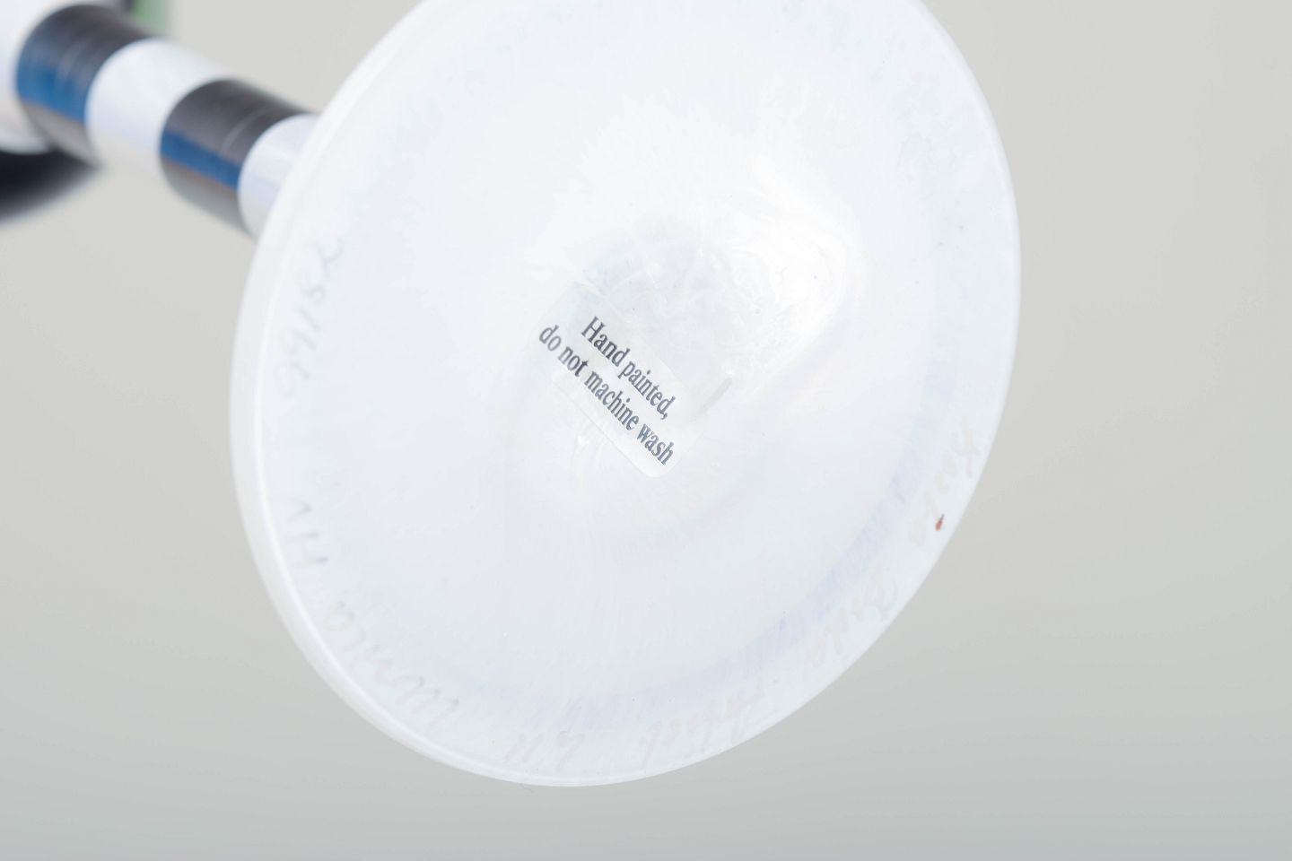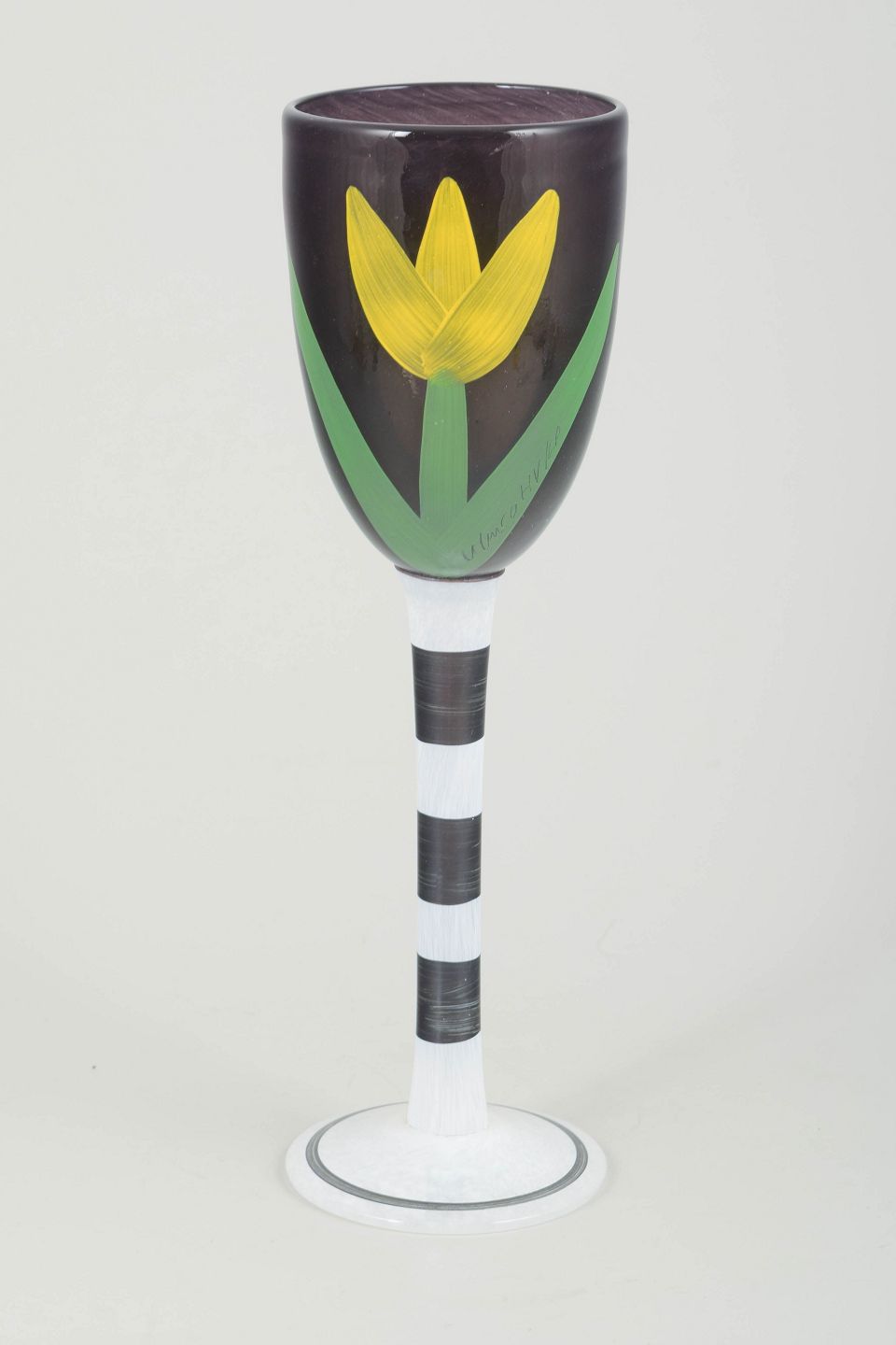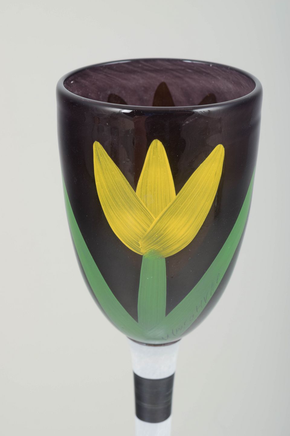 Tall decorative art glass with a hand-painted floral motif in yellow and green tones on a dark background, featuring a characteristic black and white striped stem. Signed.