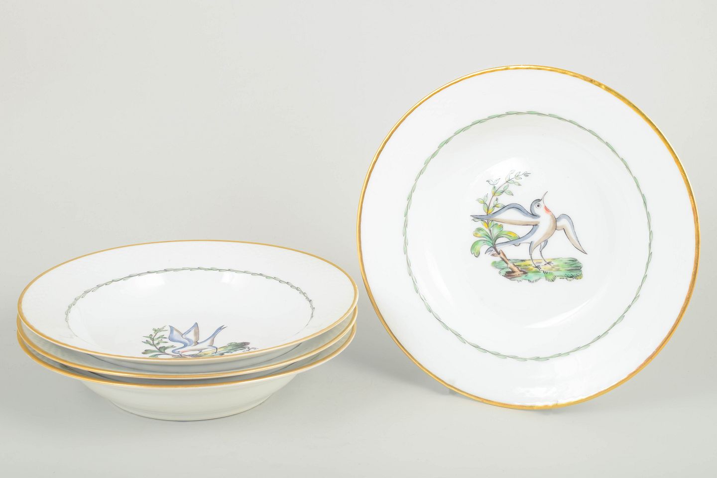 Rare deep porcelain plates by Royal Copenhagen featuring a bird and botanical motif (model 550/8107). Each plate has a gilded rim and a refined basket-weave relief along the edge.