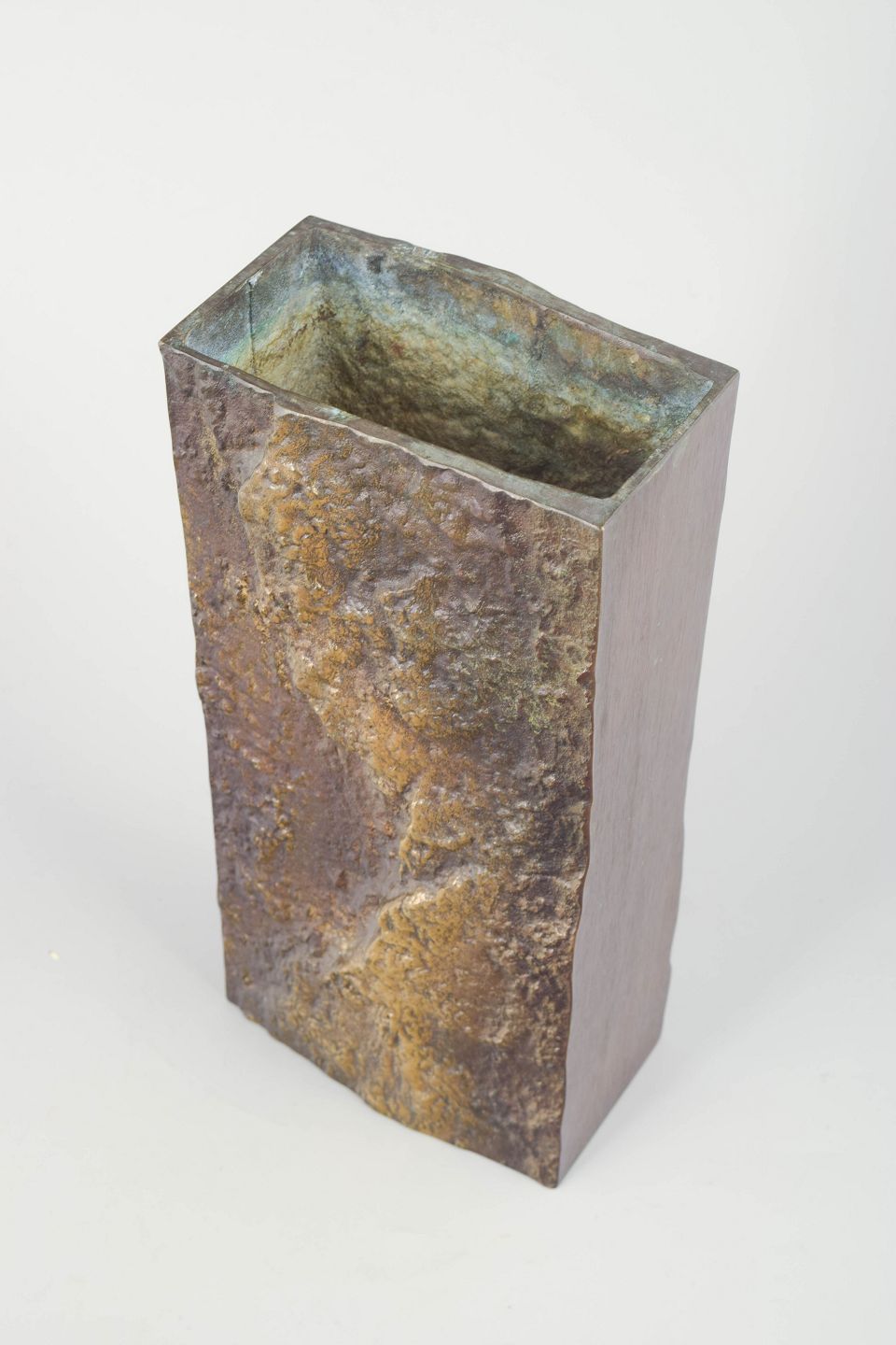 Rektangulær bronzeskulpturel vase med markant, rå strukturoverflade og plane sider, der skaber en kontrast mellem organisk relief og stram geometri. Et karakteristisk eksempel på finsk 1970’er-metalhåndværk med tydelig skulpturel tyngde.
