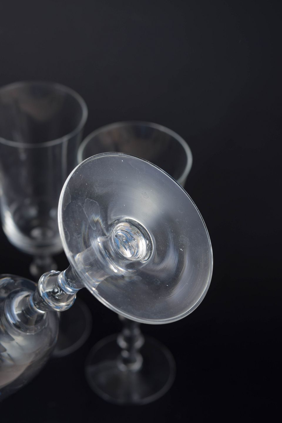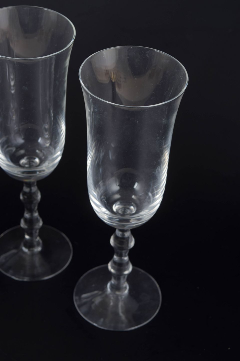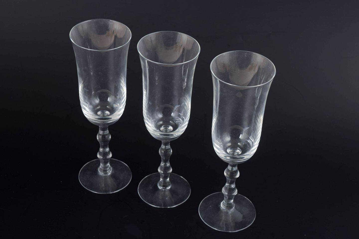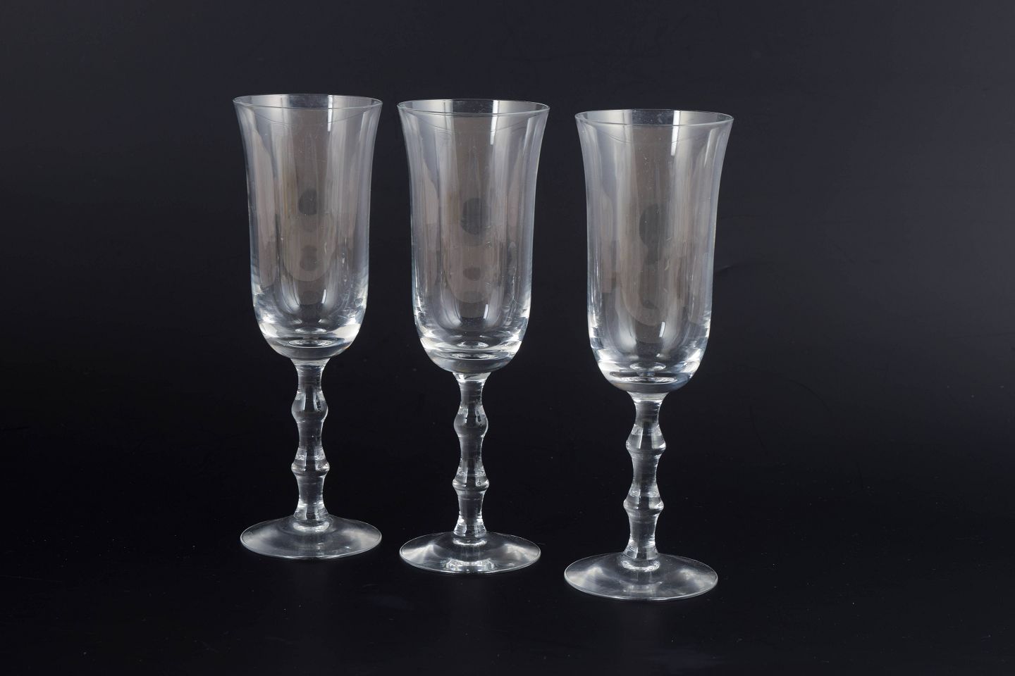 Sæt med tre champagneglas i klart glas med slank kumme og balusterformet stilk på rund fod. Klassisk skandinavisk formsprog med let og elegant proportionering, udført i Orrefors’ karakteristiske klare glaskvalitet. Modellen hedder “Salut”.