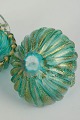 Par dekorative kurve i mundblæst kunstglas med organisk, bølget korpus og klare, opadbøjede hanke. Glasset er udført i turkisgrønne nuancer med gyldne indeslutninger, som giver overfladen dybde og et levende farvespil. Formen og dekorationen er karakteristisk for muranesisk kunstglas fra midten af det 20. århundrede, hvor funktionelle objekter ofte blev udformet som små skulpturelle værker.
