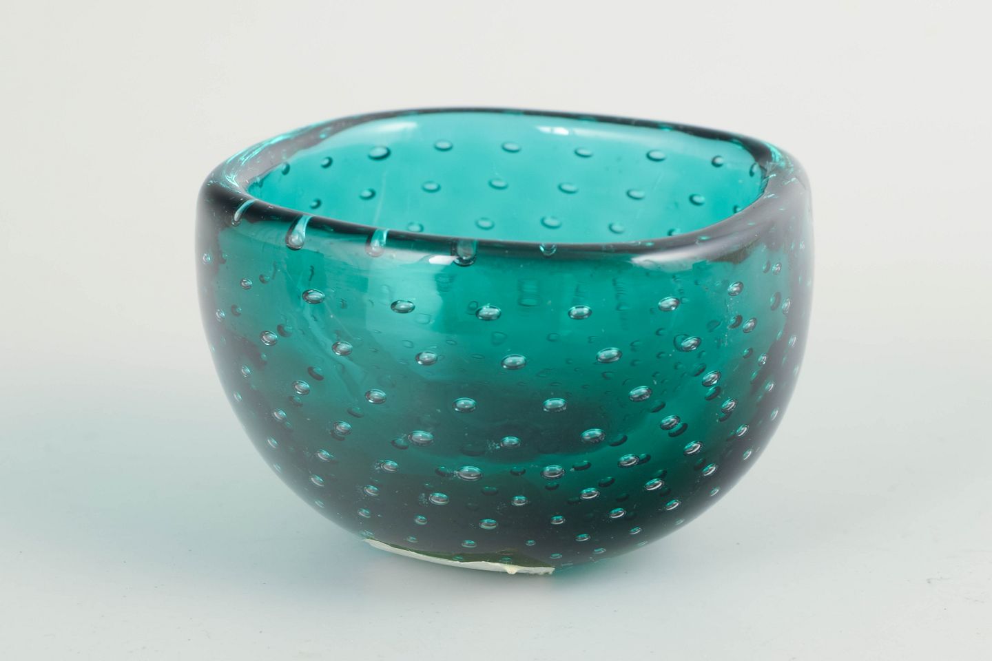 Rund skål i mundblæst glas med dyb turkisgrøn farve og jævnt fordelte luftbobler indkapslet i glasset, udført i klassisk muranesisk teknik. Den let afrundede form og den klare, transparente glasmasse giver et levende spil i overfladen og et elegant, tidstypisk udtryk. Fremstillet hos Venini i Murano i 1960’erne/70’erne.