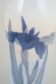 Høj, let facetteret vase i glaseret porcelæn med håndmalet underglasurdekoration af irisblomster i dybe blå nuancer med grønne stilke, udført mod en lys, let tonet bund. Dekorationen er elegant strakt langs vasens lodrette form og afspejler Royal Copenhagens naturalistiske formsprog i 1920’erne.