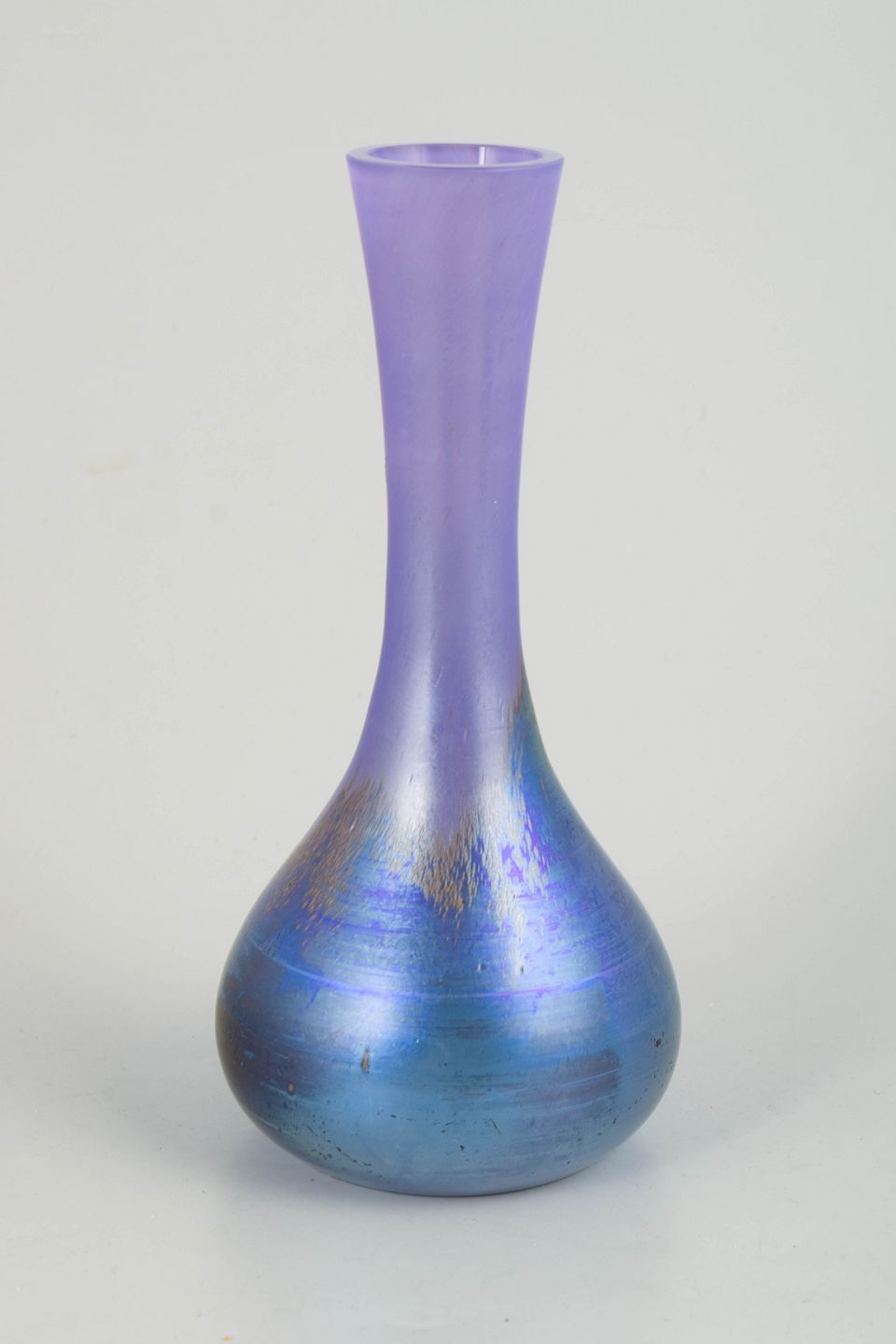 Slank Art Nouveau-vase i iriserende kunstglas med violet hals og blågrøn bug. Formen er elegant og strakt med smal åbning og afrundet krop, hvor den fine irisering giver et levende farvespil afhængigt af lyset. Overfladen fremstår let satineret med subtile glidende farveovergange, karakteristisk for Lötz’ produktion omkring år 1900.