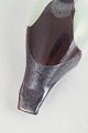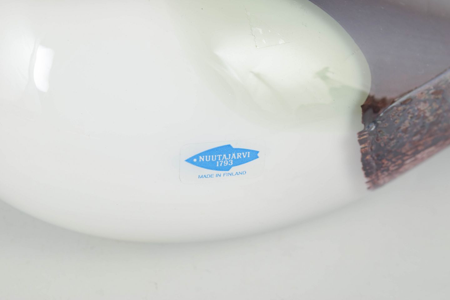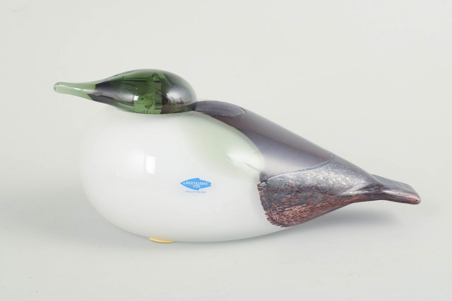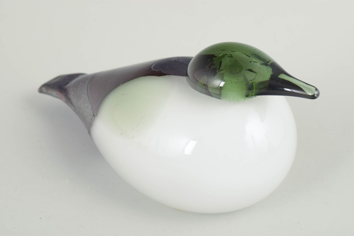 Stor fuglefigur i mundblæst kunstglas med hvid, opaliserende krop, grønligt hoved og røgfarvede til violette partier med indsmeltede farvespil; et karakteristisk eksempel på finsk studioglas fra 1980’erne.