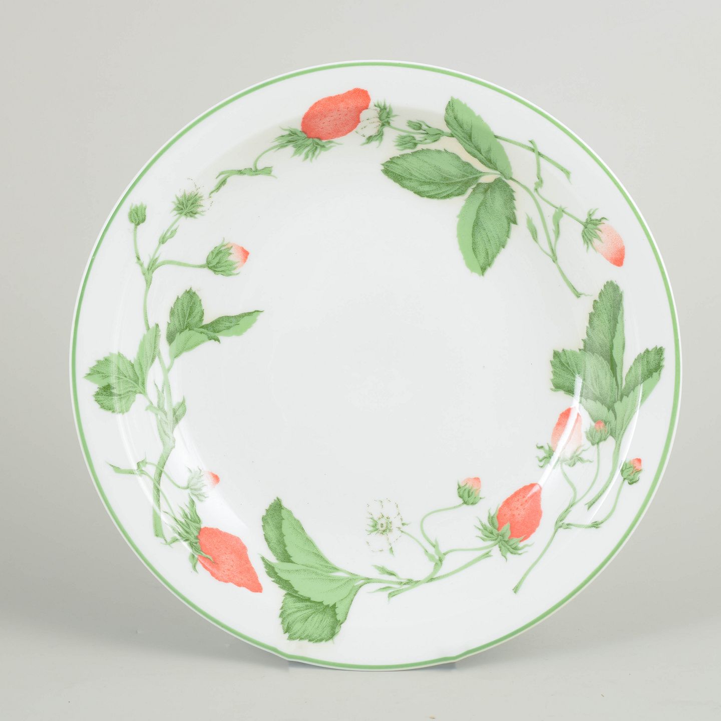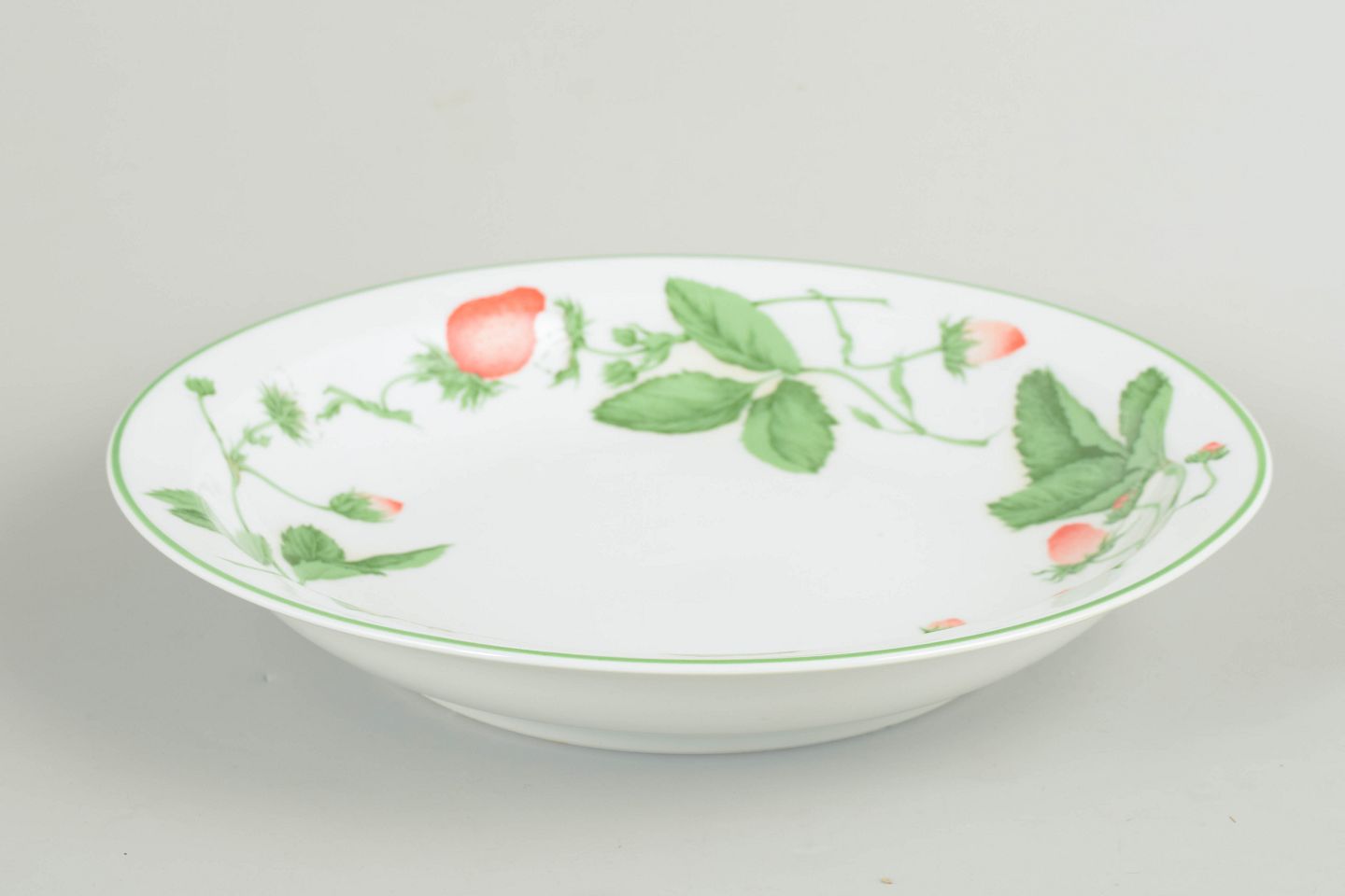 Large round porcelain bowl with strawberry and leaf decoration around the rim, from the Fraise series.