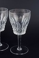 Sæt med fire franske rødvinsglas i klart krystal med facetteret kumme og klassisk stamme. Form og slibning giver et elegant lysspil og et tidstypisk udtryk fra midten af det 20. århundrede.