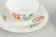 Elegante kaffekopper i hvidt porcelæn med håndmalede polykrome blomster og let bølget rand med diskret forgyldning. Mærket i bunden med Meissens krydsede sværd.
