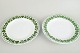 Runde porcelænstallerkener dekoreret med grøn vinløvsbort langs kanten. Nogle eksemplarer annulleret med to indridsede streger, andre med fire indridsede streger. Mærket med Meissens krydsede sværd. Én tallerken med et meget lille og ubetydeligt skår, se foto.