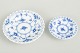 To små fade i håndmalet underglasurblå dekoration i Musselmalet helblonde, med gennembrudt blondedekoration langs kanten. Modeller 1/1145 og 1/1004. Det ene fad dateret 1969–1974, det andet dateret 1961. Ét fad i 1. sortering og ét fad annulleret med to indridsede streger.