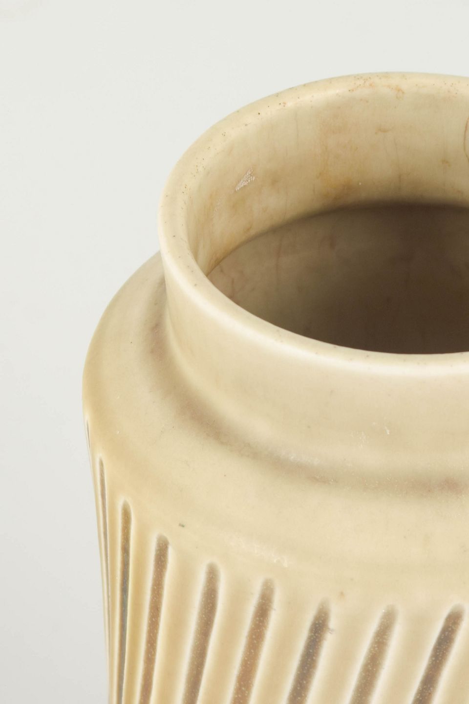 Cylinderformet vase i stentøj med lodrette, diagonalt skårne reliefspor og ensartet, lys beige glasur. Stram og modernistisk form med markant struktureret overflade.