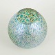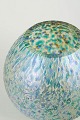 Kugleformet vase i mundblæst glas med let indsnævret åbning og afrundet korpus. Overfladen har kraftig iriserende dekoration i blå, grønne og gyldne nuancer med tæt, organisk struktur, der giver et levende og næsten mosaiklignende farvespil. Den kompakte form kombineret med den rige overfladevirkning er karakteristisk for Loetz’ produktion i 1920’erne, hvor eksperimenterende dekorationsteknikker fortsatte efter art nouveau-perioden.