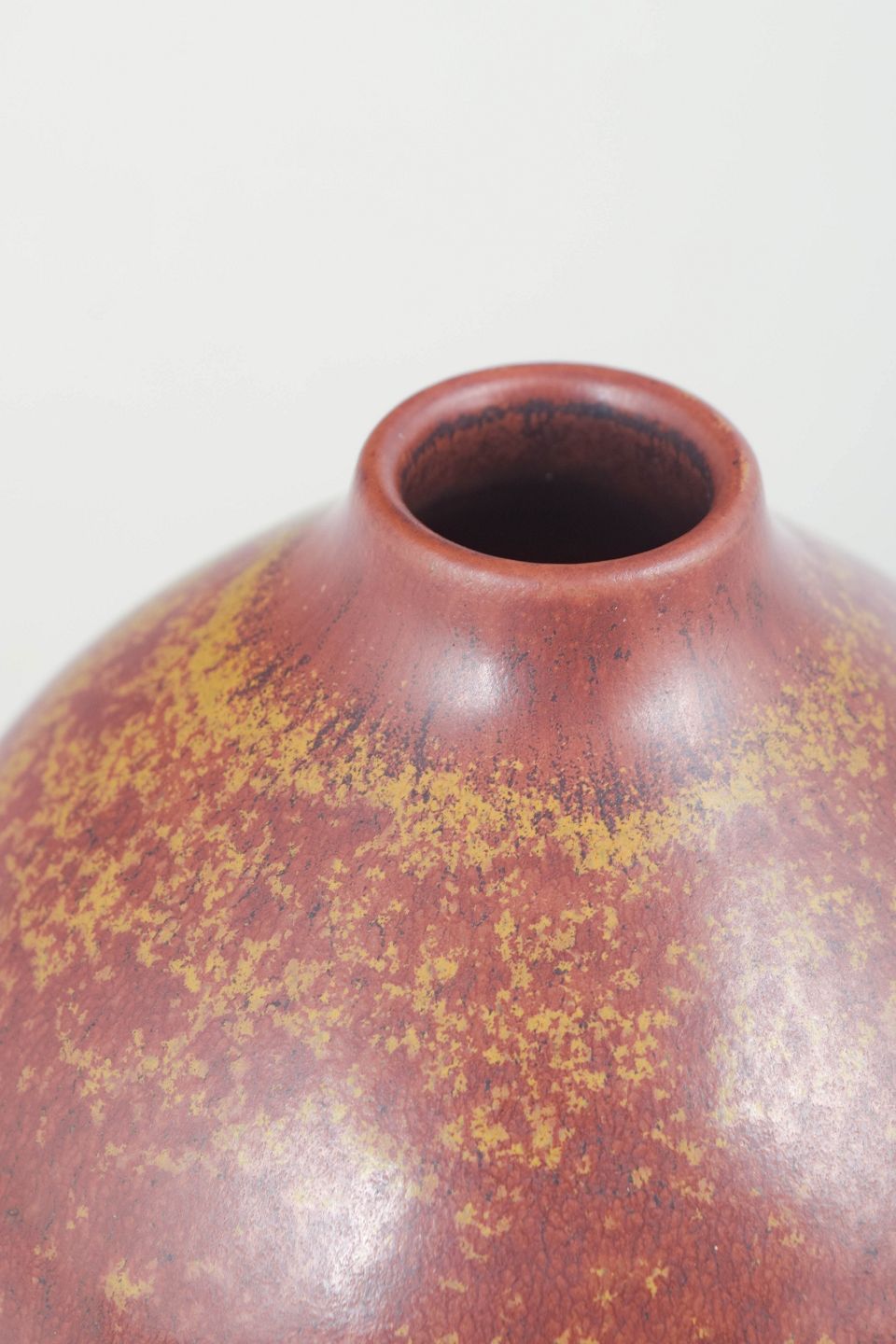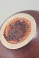 Organisk formet vase i stentøj med rund korpus og smal hals, dekoreret med dyb rødbrun glasur med gyldne nuancer.