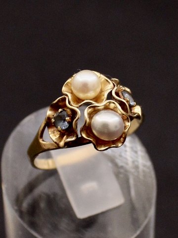 14 karat guld ring med ægte perler og aquamariner