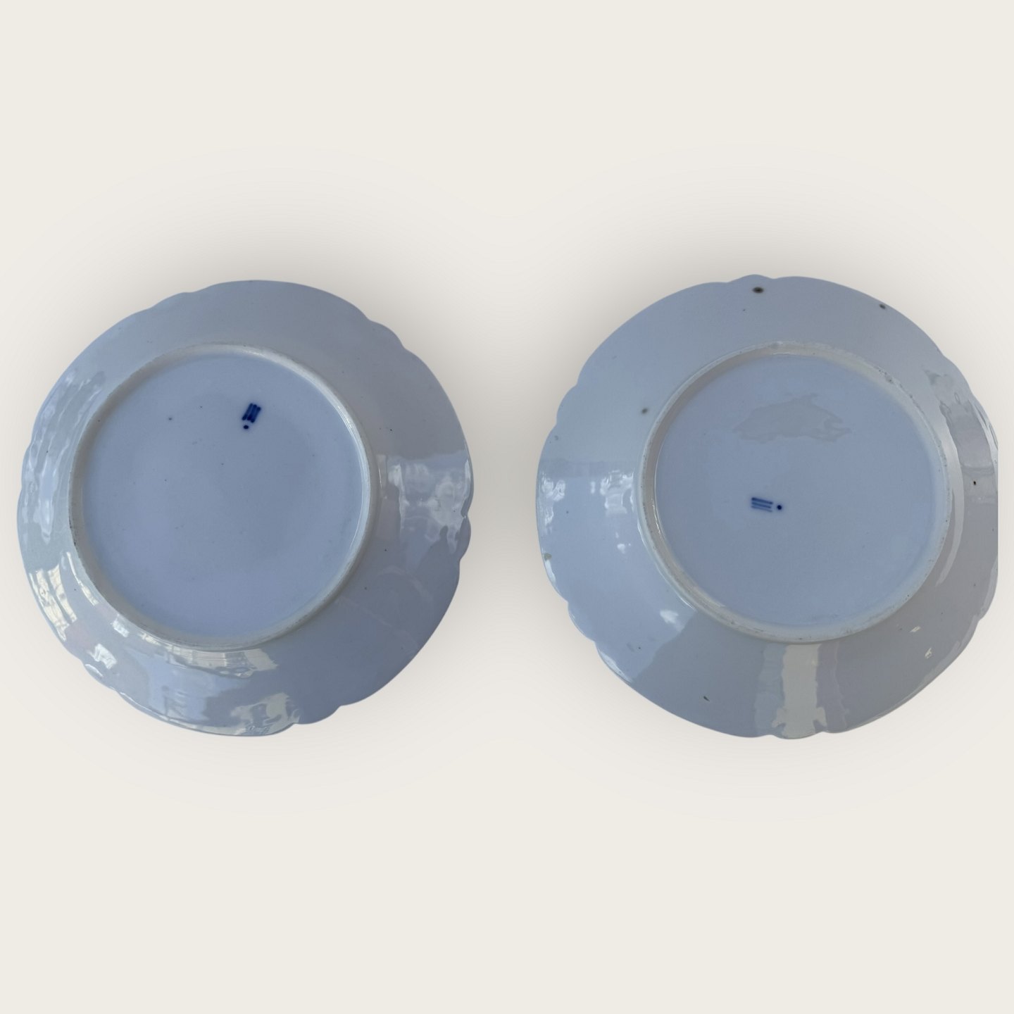 Royal Copenhagen, Rococo white / Rokoko hvid, flat plate, 19 cm in diameter, 2 pcs. in fine slightly patinated condition, we also have 3 pcs. with defects/repairs for 125kr each (see last 2 photos)