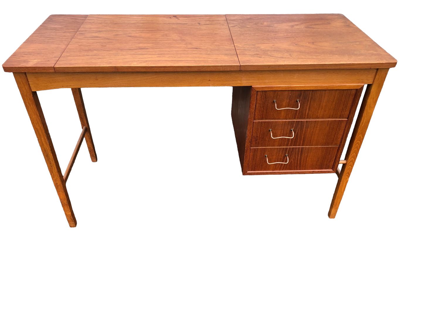 Schminktisch / Schreibtisch in Teakfurnier. Dänische Moderne aus den 1960er Jahren. Ein paar kleine Flecken/Gebrauchsspuren (siehe Foto) ansonsten schöner gebrauchter Zustand. Abmessungen: HxLxB 72x116x48 cm