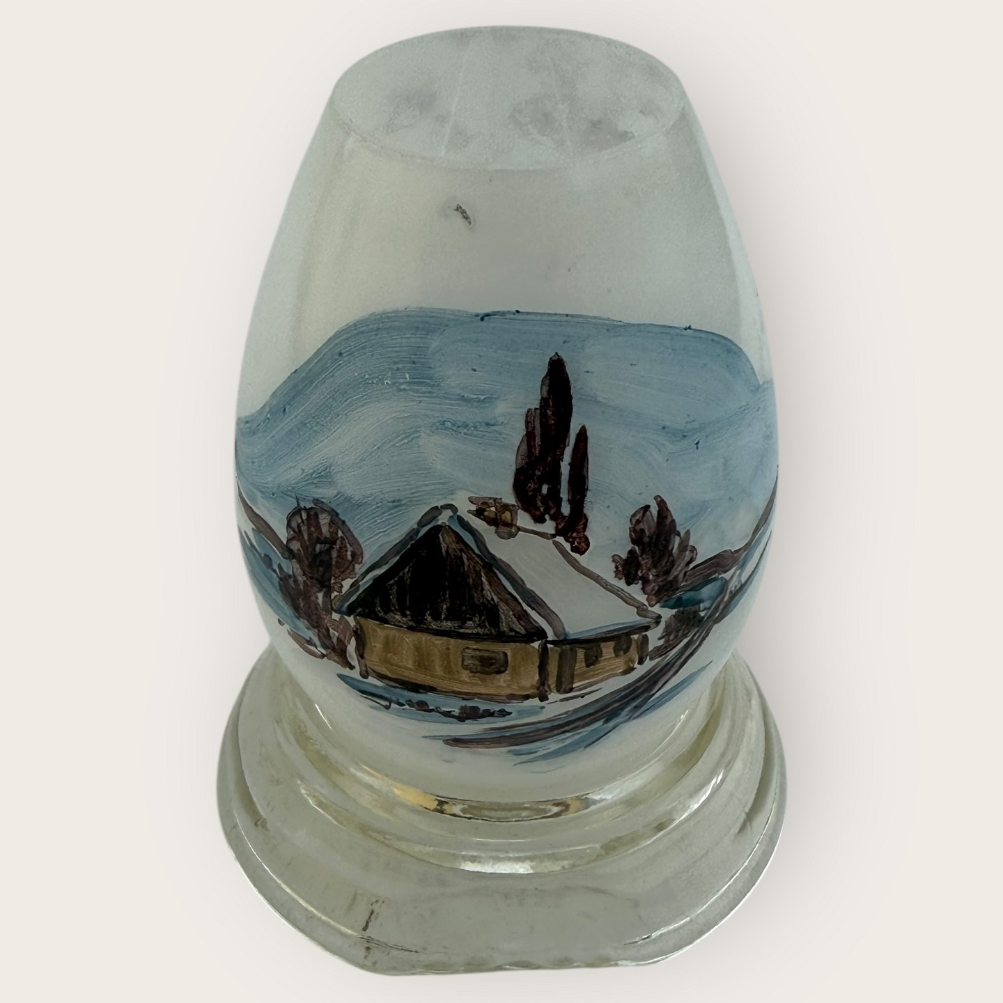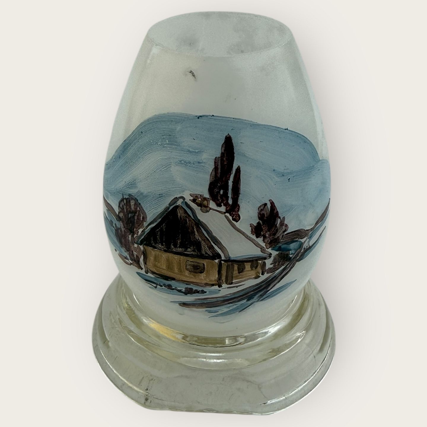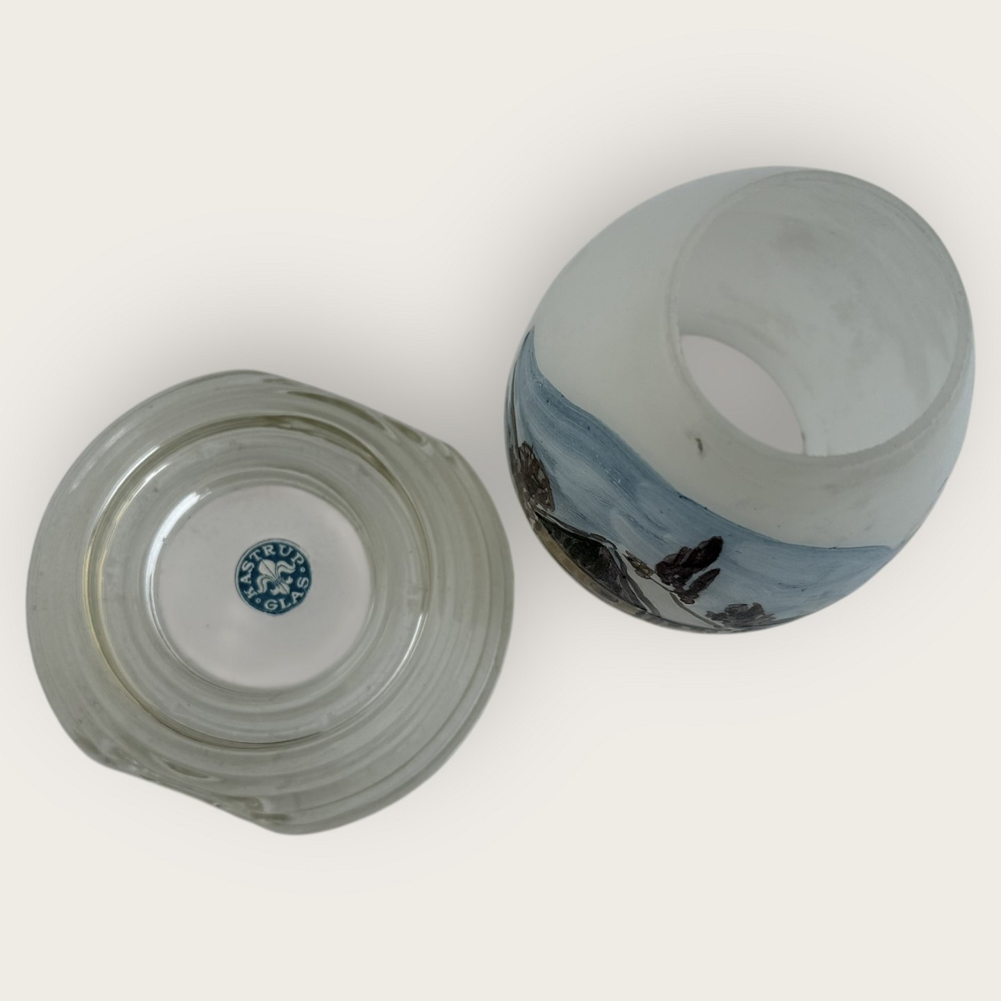 Kastrup Glasværk, hyggelampe med håndmalet dekoration til fyrfadslys, ca. 9cm høj *Et par mørke pletter i det øverste glas ellers fin stand *