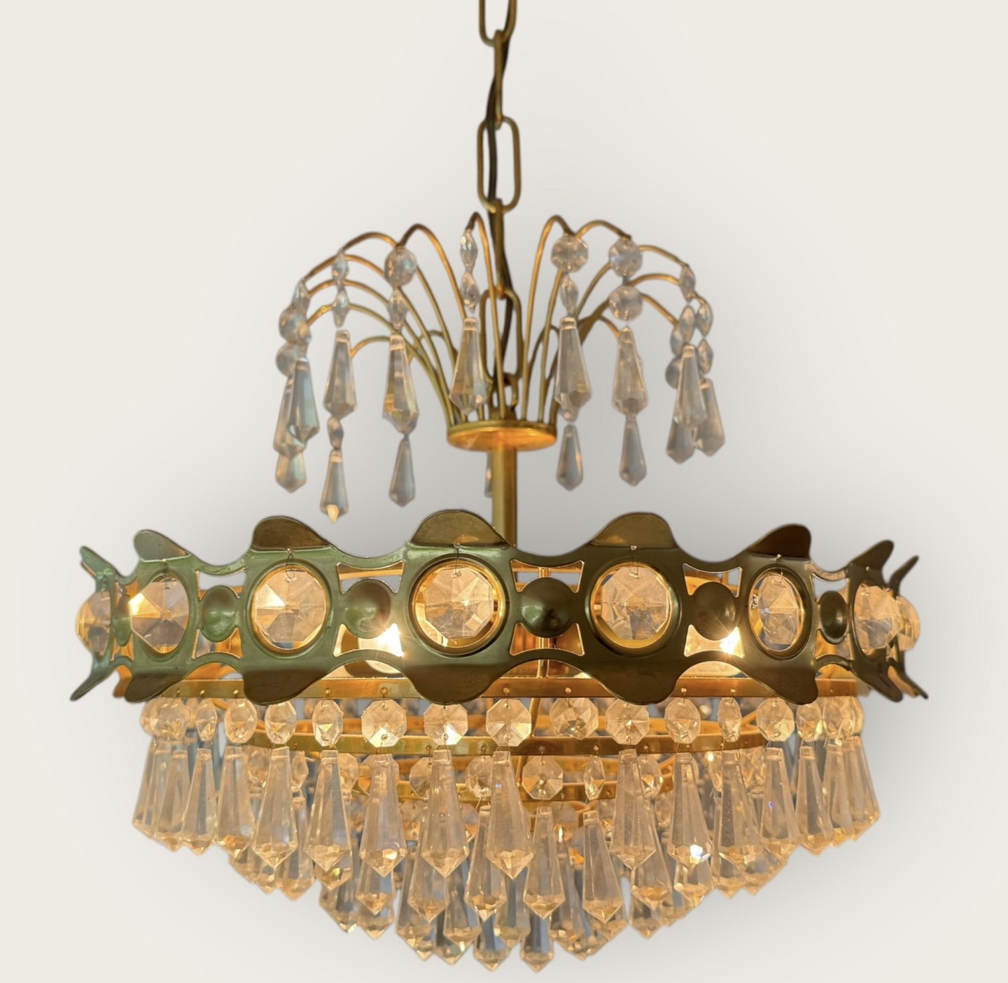 Lysekrone i messing med mange glasprismer, fungere fint og med alle prismer, Diameter ca. 36cm *Pæn brugt stand*