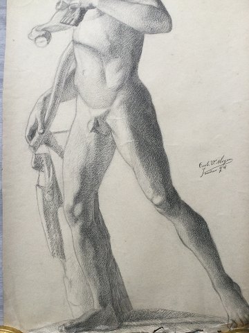 Carl V. Meyer (1870-1938): Nøgen mand - Jæger med bytte på ryggen 1894. Akademitegning. Kul på papir. Sign.: Carl V. Meyer dateret - Januar 94 Uden ramme 78x45 12725
