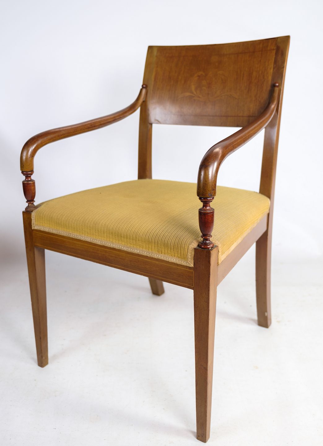 A pair of Danish Empire hand-polished mahogany armchairs with intarsia in the back of the chair from around the 1920s.