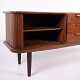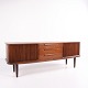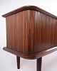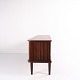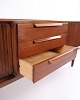 Skænk fra 1960’erne, udført i teaktræ med tre centrale skuffer og jalousilåger i siderne.