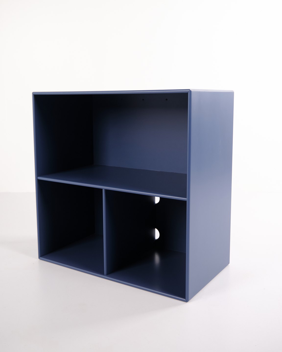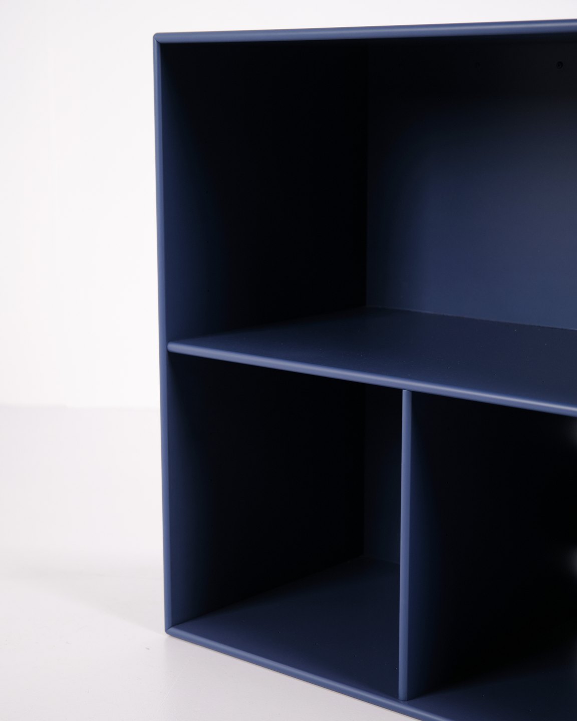 Montana reol i blå. Udstyret med tre åbne hylder, ideel til opbevaring eller udstilling i stue, kontor eller entré. Klassisk Montana-modul med enkel opbygning og høj funktionalitet.