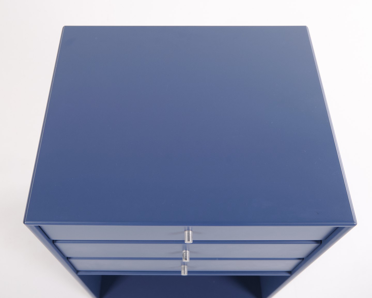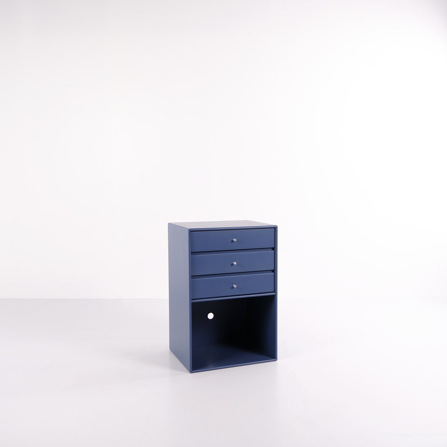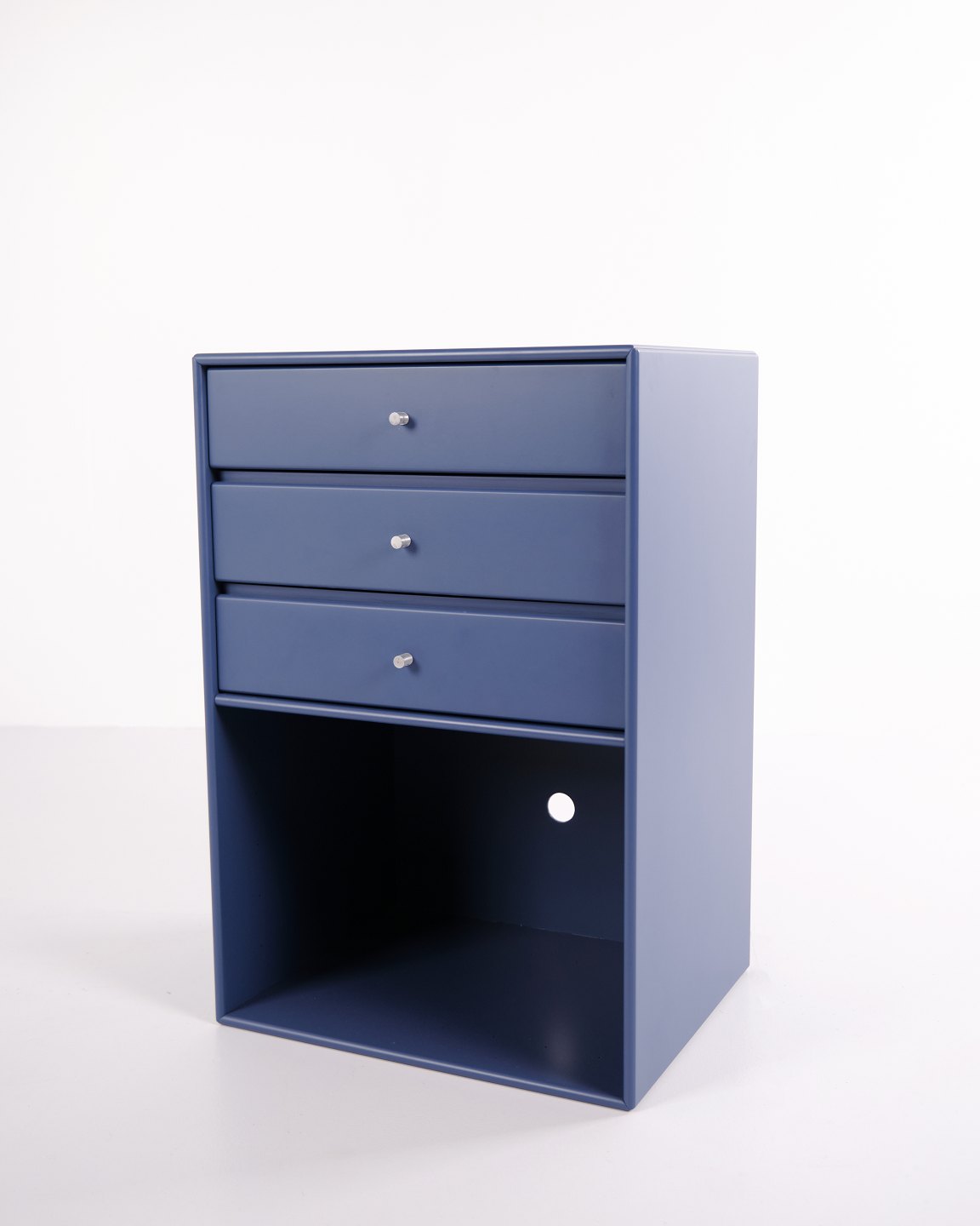 Montana reol i blå. Indrettet med tre skuffer og én åben hylde, velegnet til både opbevaring og display. Et klassisk Montana-modul, der kombinerer funktionalitet og enkelt design.