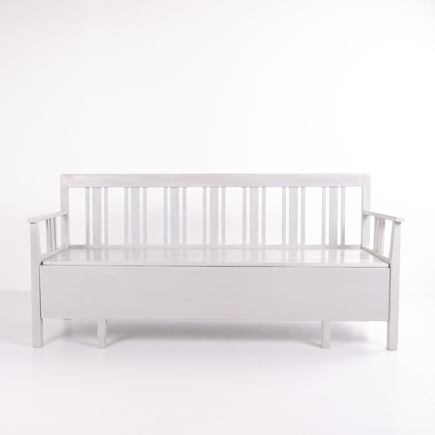 Svensk slagbænk fra ca. 1860’erne, udført i fyrretræ og gråmalet i senere tid. Klassisk skandinavisk møbel med dekorative bemalinger og praktisk sidde- og opbevaringsfunktion. Et solidt antikt stykke med tidstypiske detaljer.