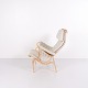 Pernilla lænestol med tilhørende skammel, model 69, designet af Bruno Mathsson og fremstillet af DUX som 35 års jubilæumsudgave. Stolen er udført i bøgetræ med polstring i lyst stof og har et karakteristisk, ergonomisk formsprog, der følger kroppens naturlige kurver og sikrer høj komfort.