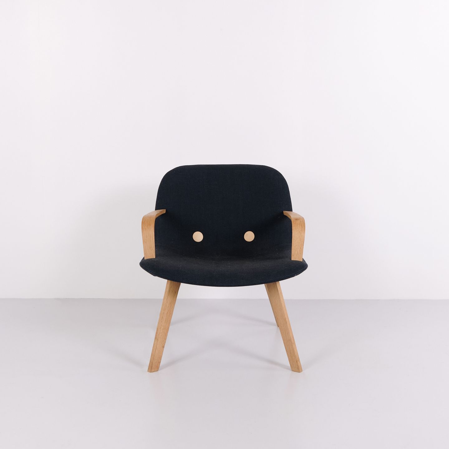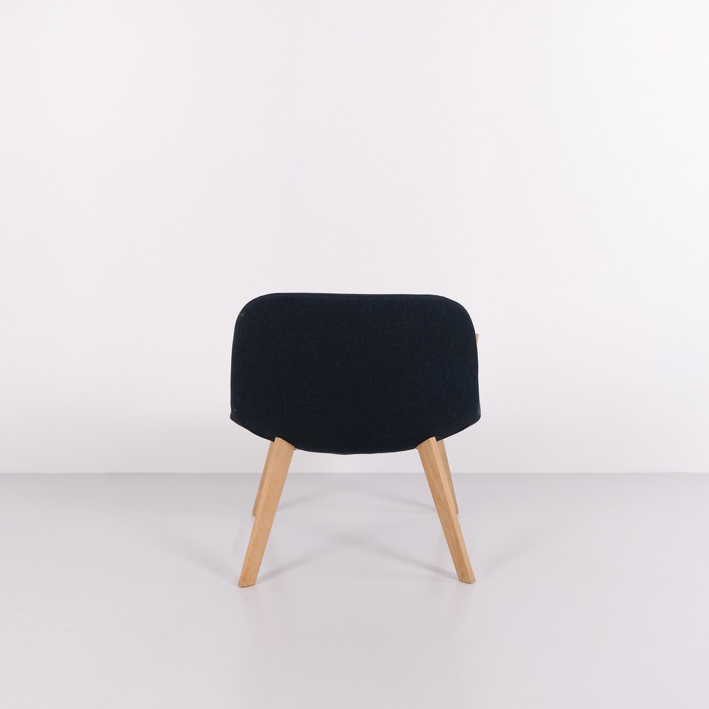 Erik Jørgensen loungestol model EJ 3 i egetræ og blåt stof. Dansk design med enkelt og tidløst formsprog.
