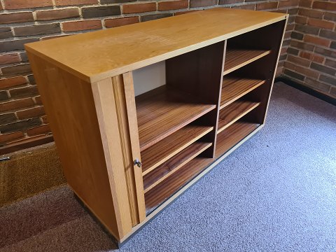 Arkivskab fra 1980'erne i finéret eg med jalousi låge. Fremstår pænt og velholdt, dog med lettere brugsspor på toppen. (Billeder) Forskellige indretningsformer haves. Fungerende nøgle medfølger.