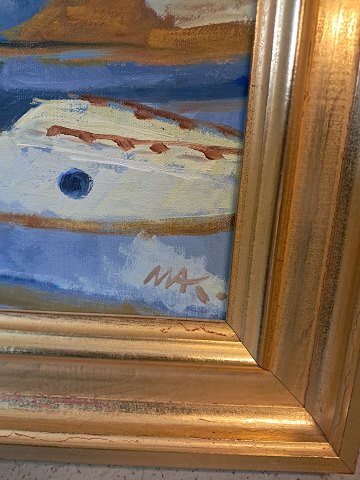 Maleri af Dragør Havn i guldmalet ramme, af : Mogens Amdi Thorsen (1924-2016)
