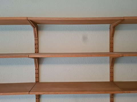 Cado vægreolsystem fra 1960'erne i eg designet af Poul Cadovius. Sættet består af 1 kommode (HxBxD 52x80x38), 2 hylder (HxBxD 2x80x38), 3 hylder (HxBxD 2x80x30), 12 hylder (HxBxD 2x80x33) og 4 vanger til ophængning. Generelt i pæn brugt stand dog svajer et par hylder en anelse. (Billede)
