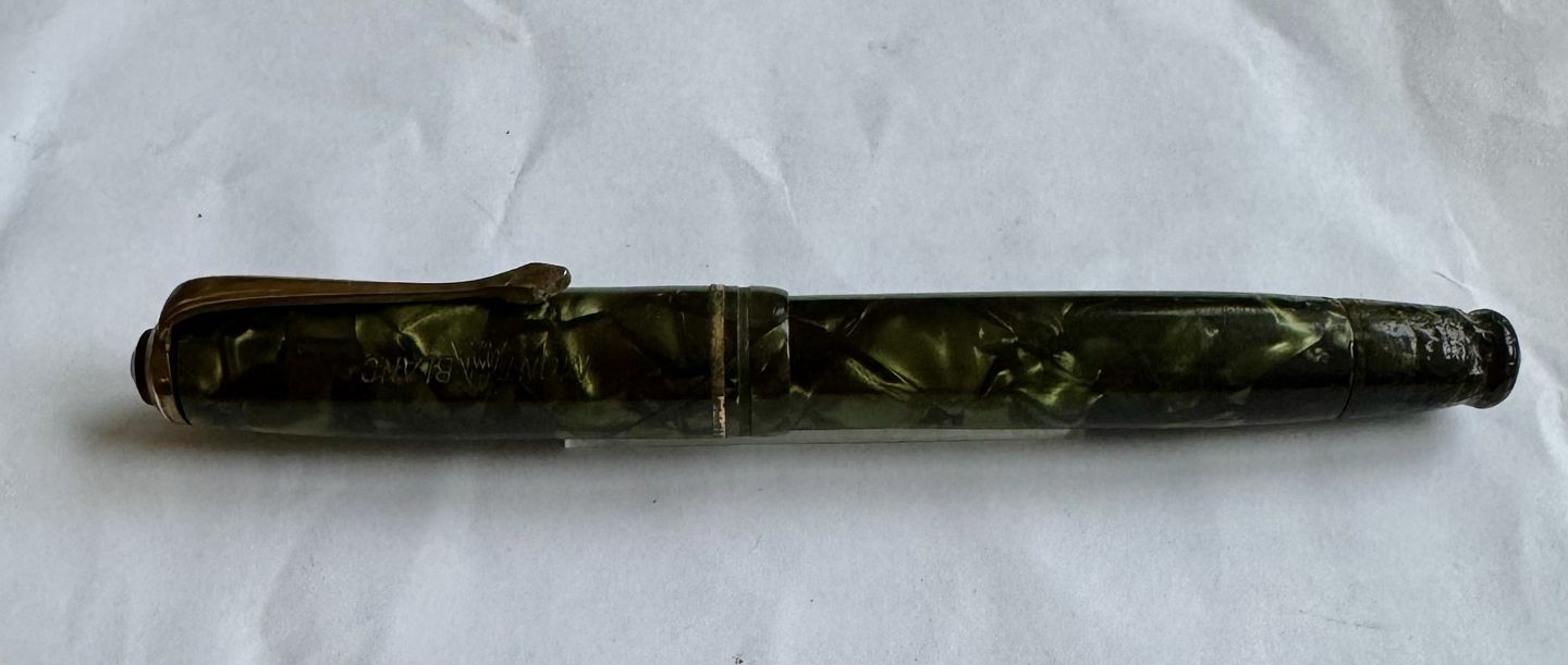 Green marbled Montblanc no. 244 fountain pen. Made around 1950. All parts original Montblanc parts. The little cap on the bottom of the fountain pen is completely bitten out of shape. In addition, a metal cap belt is missing On the cap. Otherwise no defects or missing parts. A new rubber sack must be inserted before it will work again. This can be added with a supplement of DKK. 225.- Dimensions: L. 13 cm.