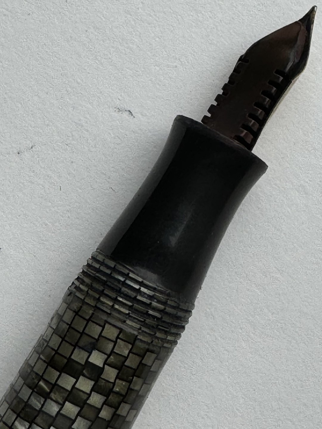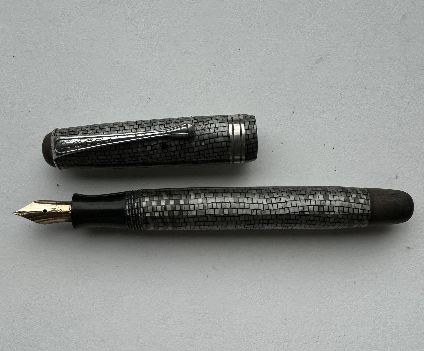 Small Penol fountain pen in “snakeskin” made in Denmark around 1940. Appears in good condition without damage or repairs. All parts are original to this model including a 14 carat Penol Gold nib. Does not work. A new rubber sack must be inserted before the pen can absorb ink and write again. Dimensions: 11.2 cm.