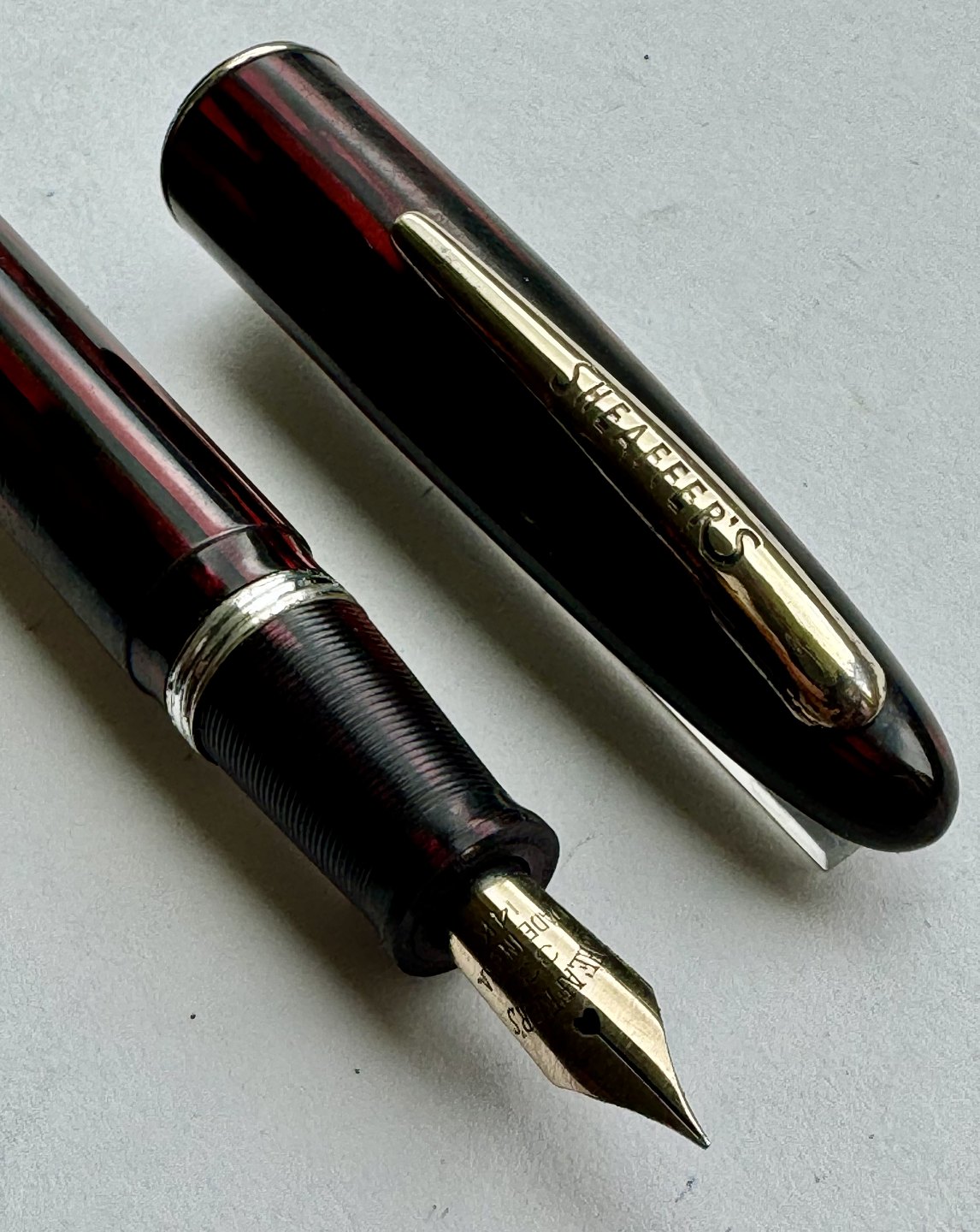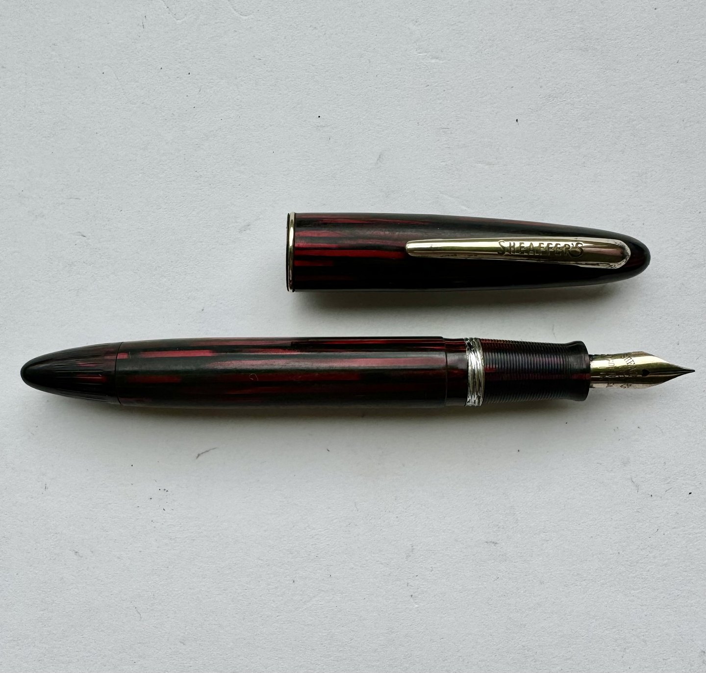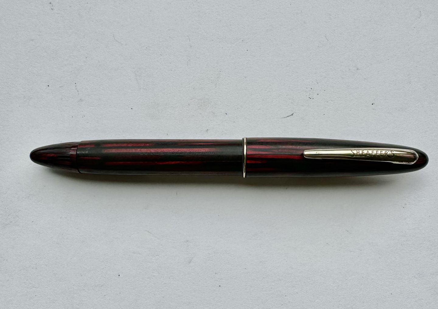 Rød og sort stribet Sheaffer fyldepen fra Sheaffer Pen Co. I U.S.A. Fremstår i god stand med skal repareres før end den igen holder blæk. Ingen skader eller reparationer. Alle dele originale til denne model. Mål: 12,5 cm lang.