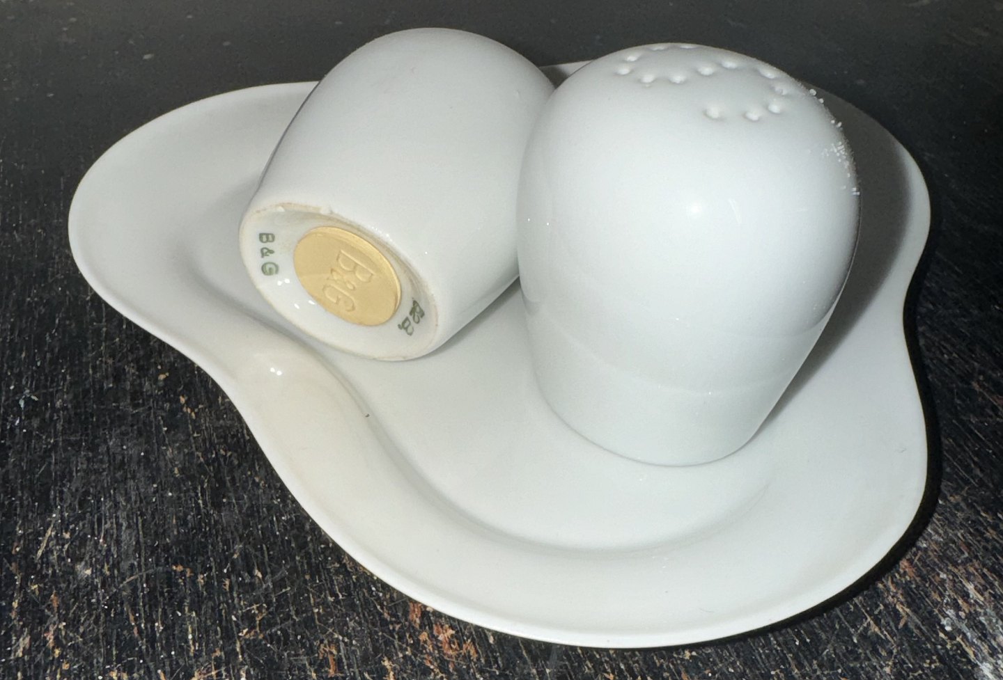 Bing & Grøndahl salt -og pebersæt i hvidt porcelæn på bakke. I god stand