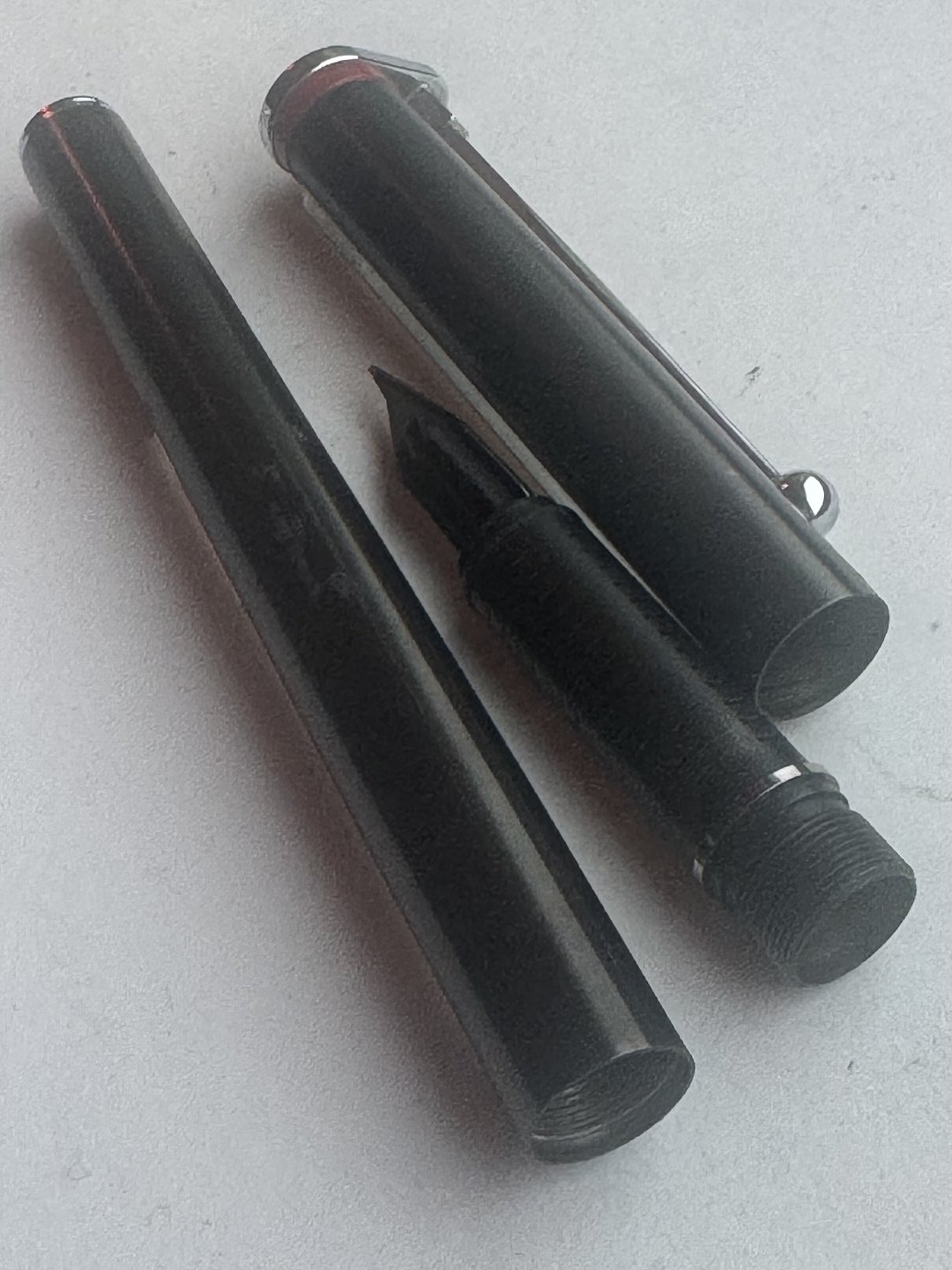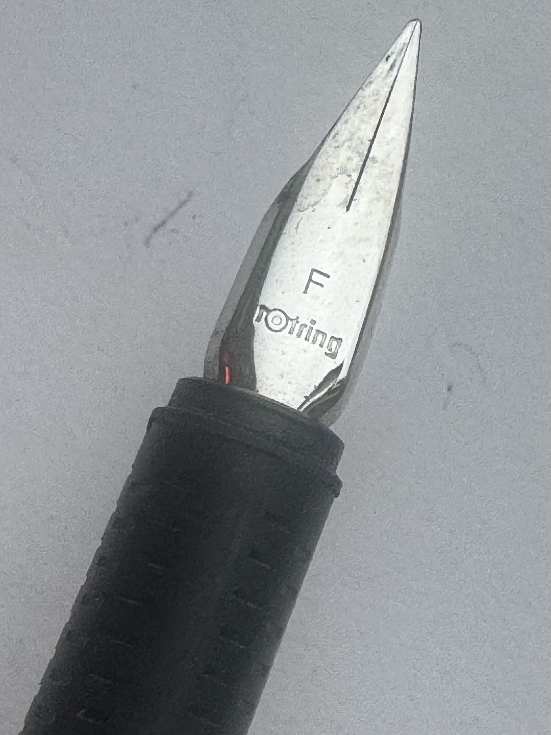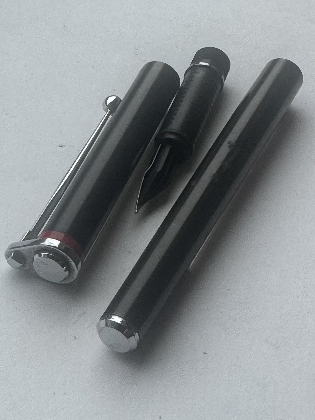 Rotring 700 fyldepen i stål fra 1990’erne. Fremstår i god og skriveklar stand. Mangler blot ny blæk-patron (cartridge) for at kunne skrive igen. Længde 14 cm.