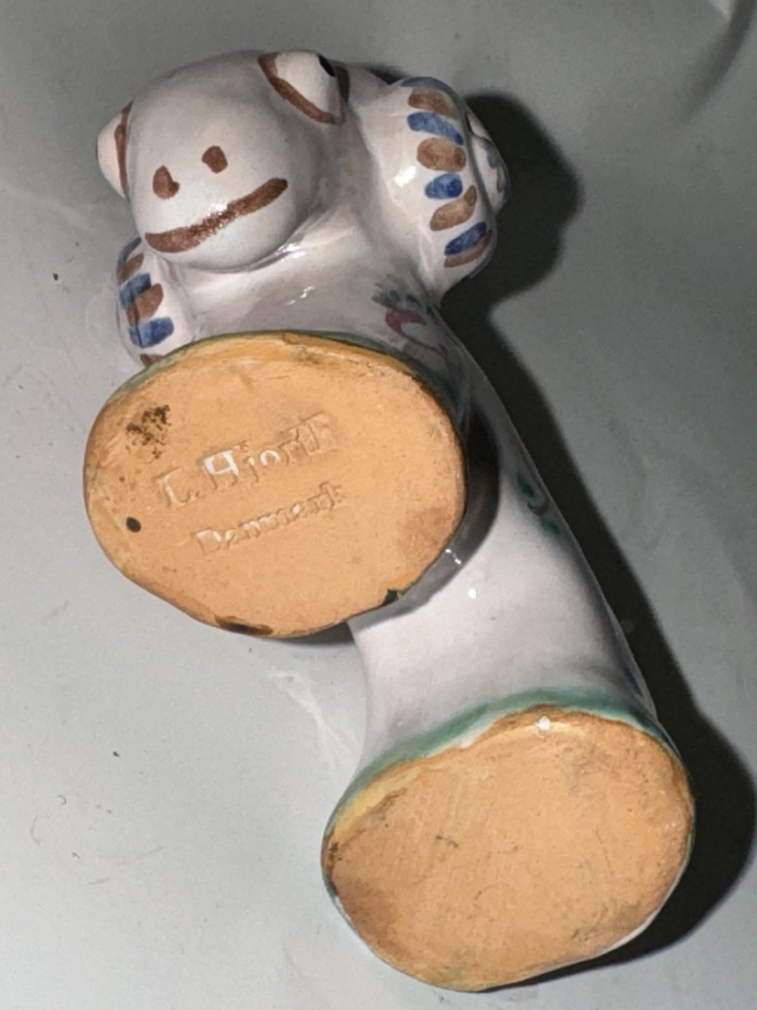 L. Hjorth samt Danmark på undersiden. Mål: H. 5,5 cm L. 7,5 cm