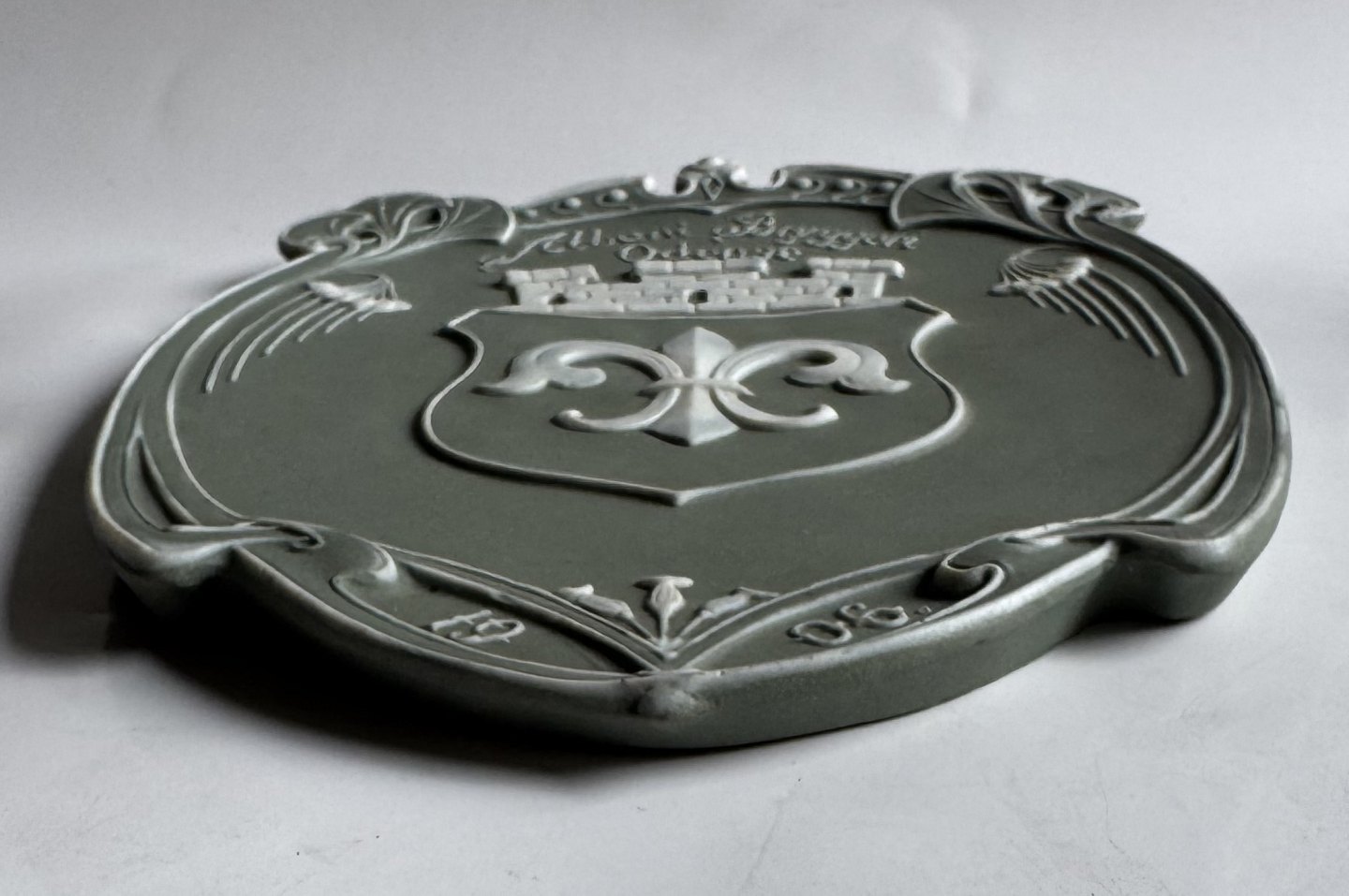 Fynsk øl : Bryggeri platte Albani Bryggeri i Odense fra 1906. Hvid dekoration i relief på grøn baggrund. Fremstår i god stand uden skader eller reparationer. Mål: 19,5 x 14 cm.