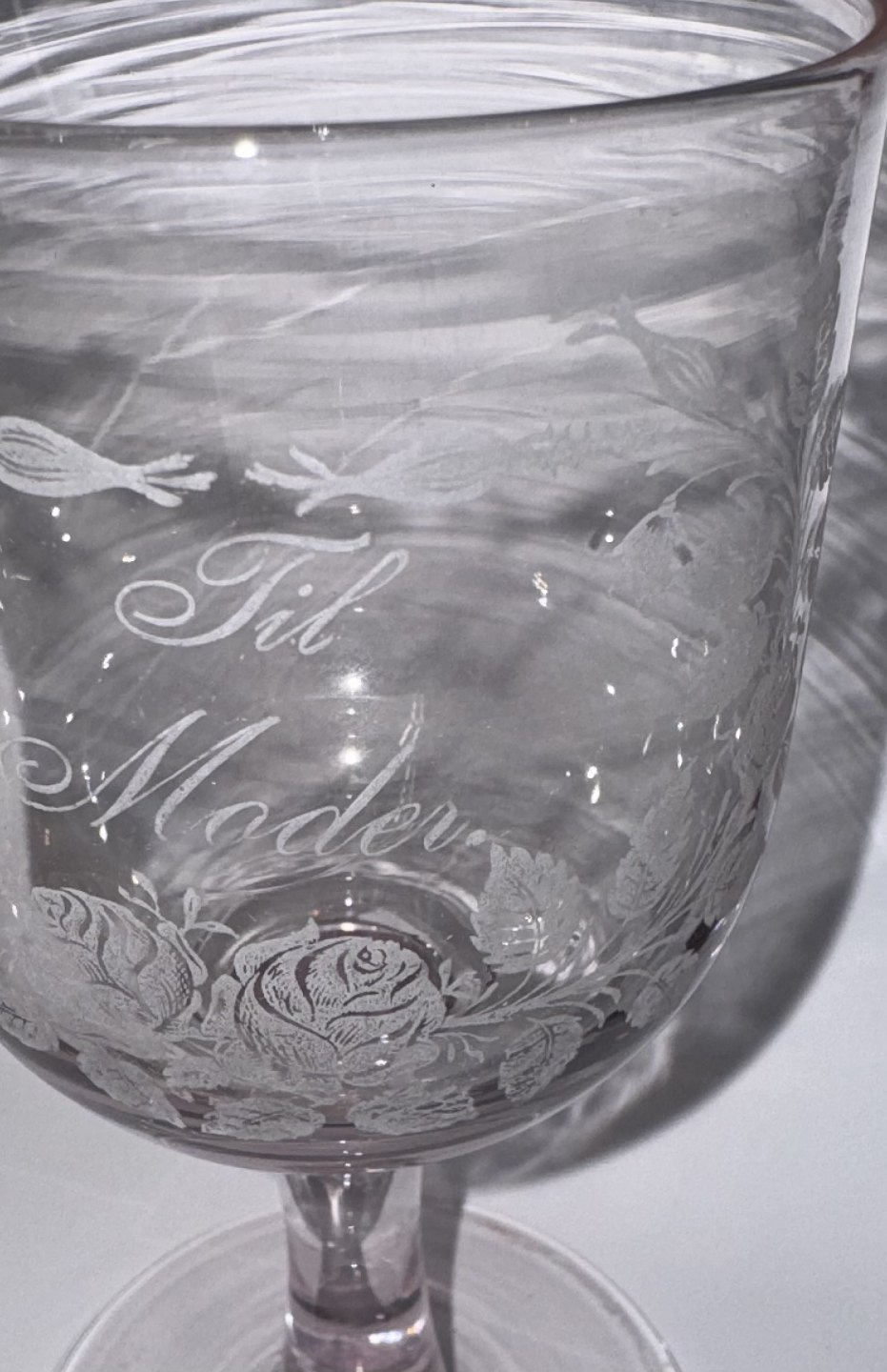 Gammelt dansk vin glas fra Kastrup Glasværk i form af erindringsglas fra ca. 1910. Fremstår i god stand uden skader eller reparationer med teksten: "Til Moder". H. 16 cm