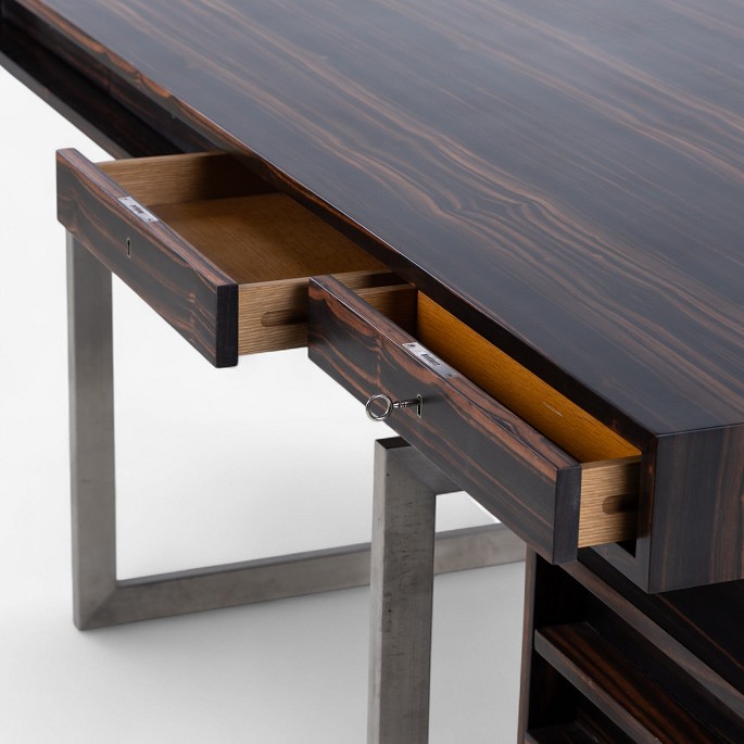 Walnut desk with four drawers, drawer module on wheels and steel frame.