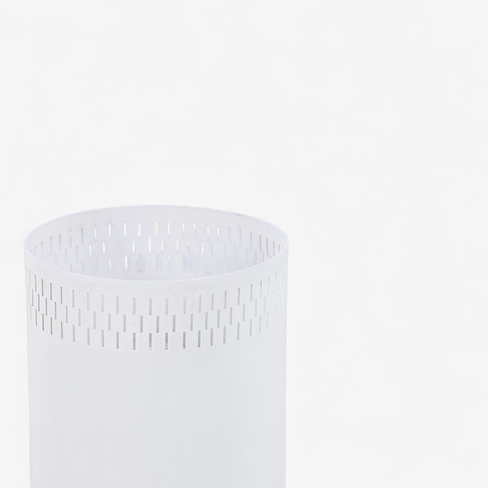 Cylindrical table lamp with a base in patinated teak and a shade in white lacquered metal.