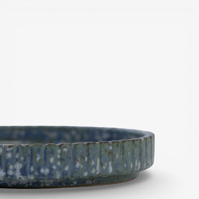 Rundt fad i riflet stentøj med blågrøn glasur. Signeret.