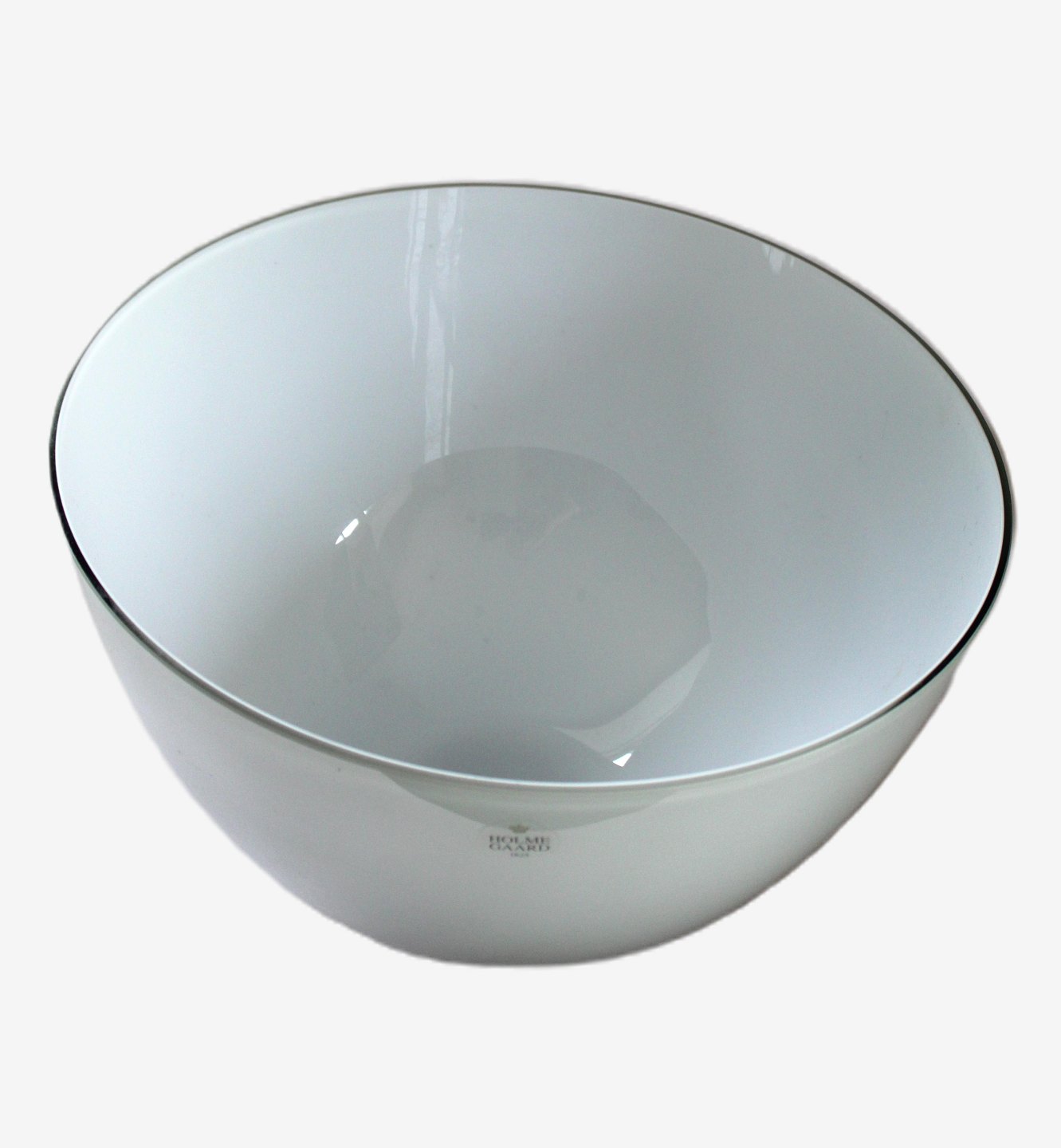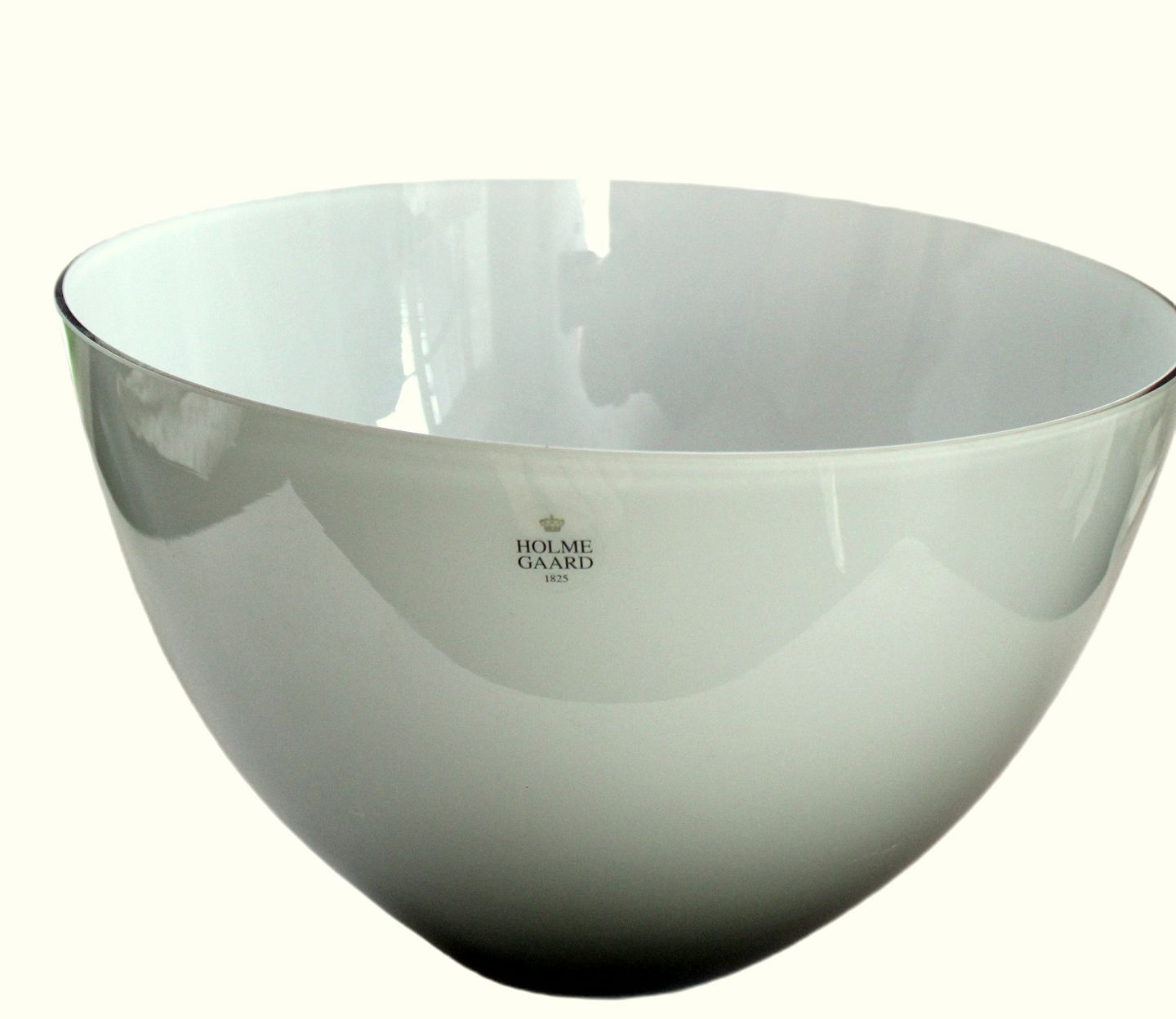 Holmegaard, Cocoon stor skål i udvendig lysegrå farvet glas og hvid indvendig. Designet af Peter Svarrer i 2005. Peter Svarrer starter på Holmegaard i 1997 og er kaldt for lysets mester, manden der bragte Holmegaard ind i det nye millennium efter Michael Bang og Per Lütken.