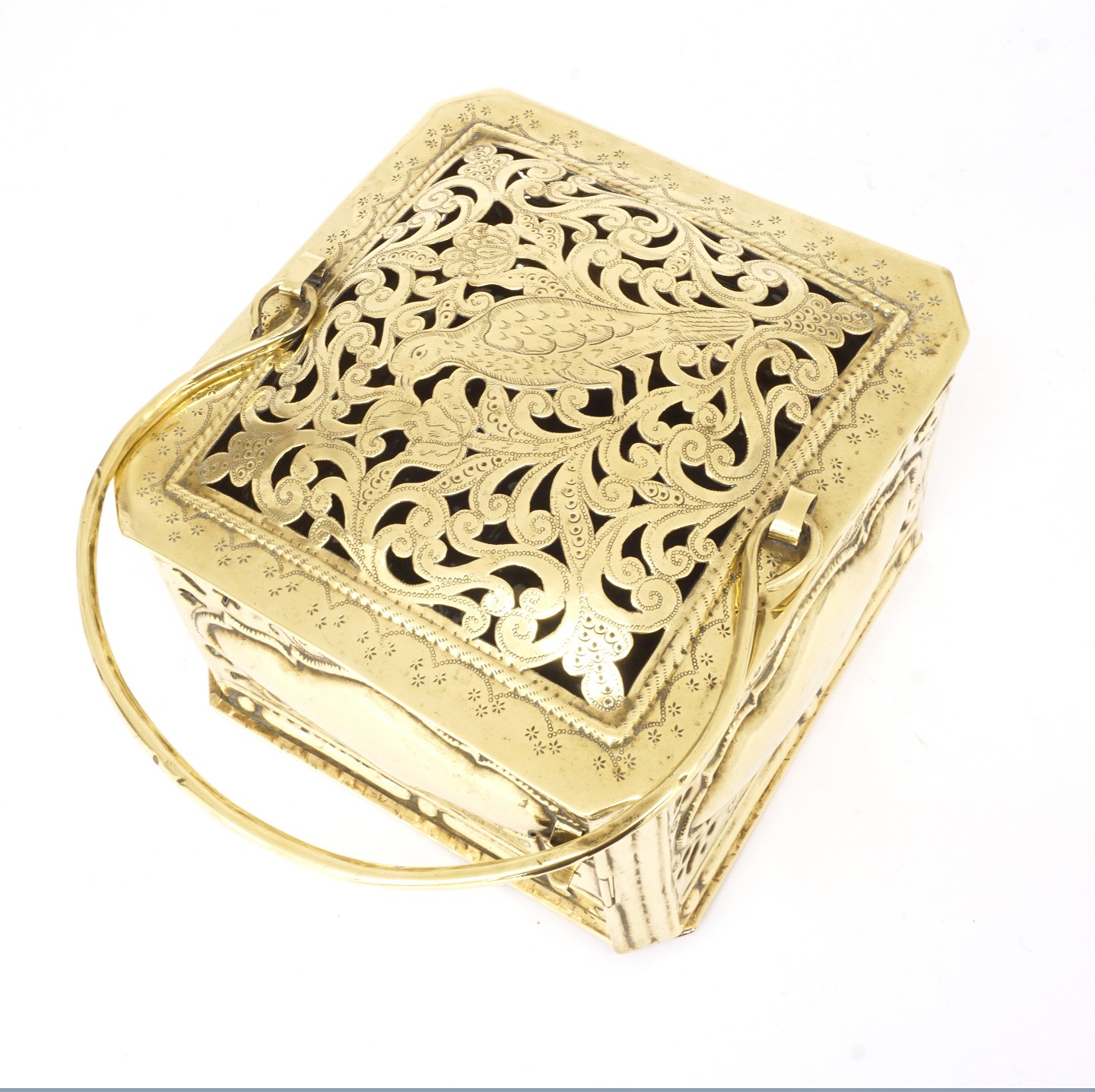 Ildkike af messing. Rigt dekoreret med gennembrudte dekorationer bl.a. i form af fugl
