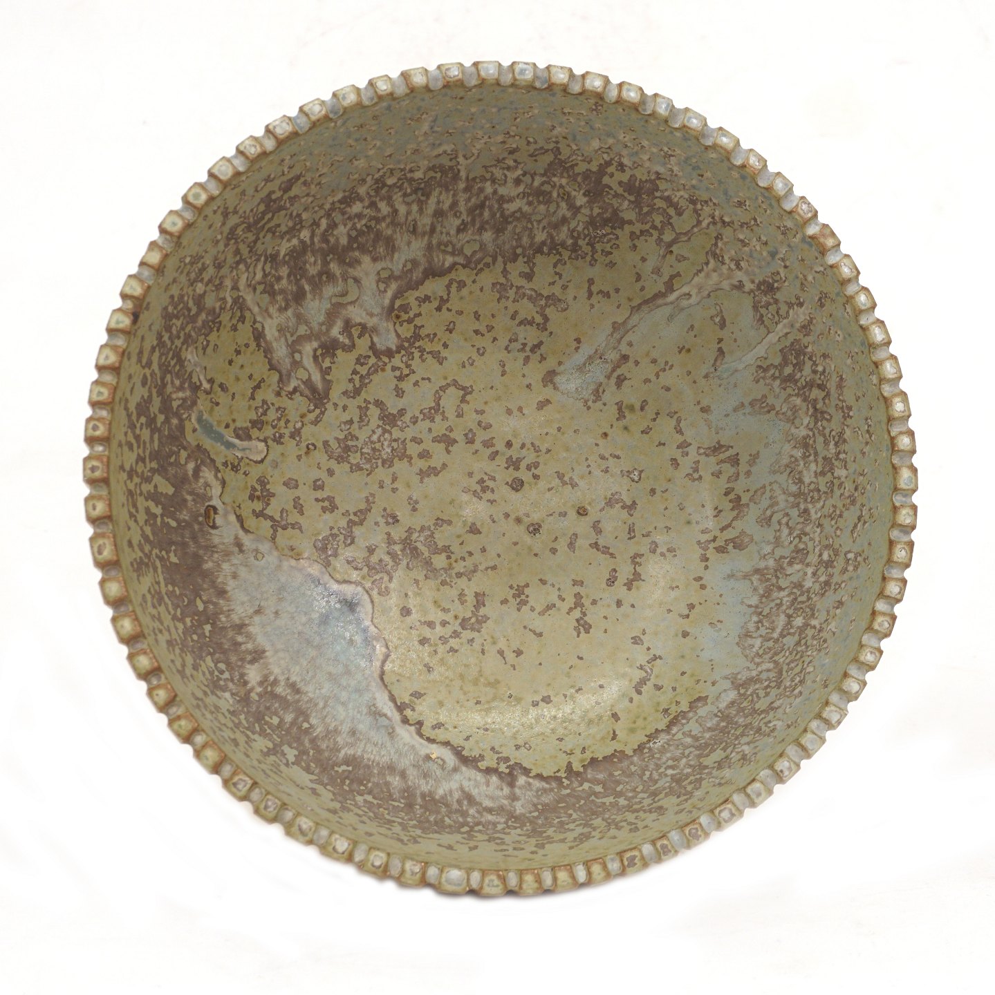 Arne Bang skål i stentøj med grønblå spættet glasur og riflet korpus