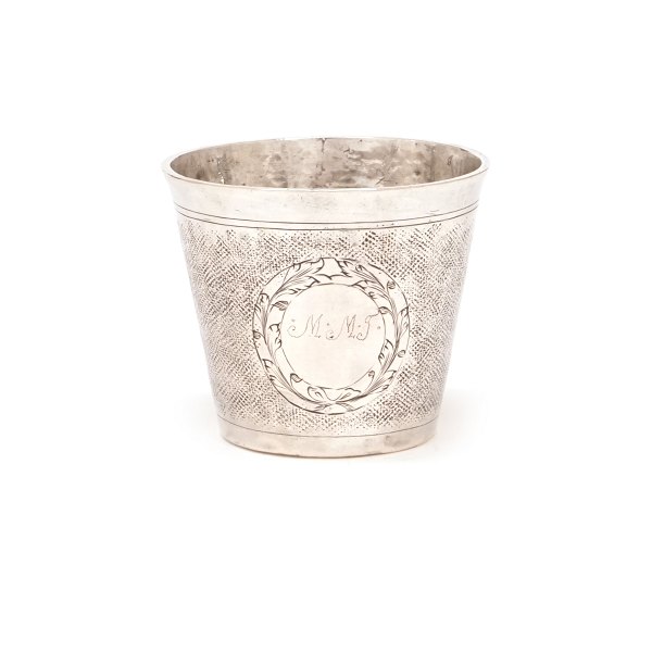 Lille konisk nålepunslet barok sølvbæger. H: 5,3cm. V: 48gr