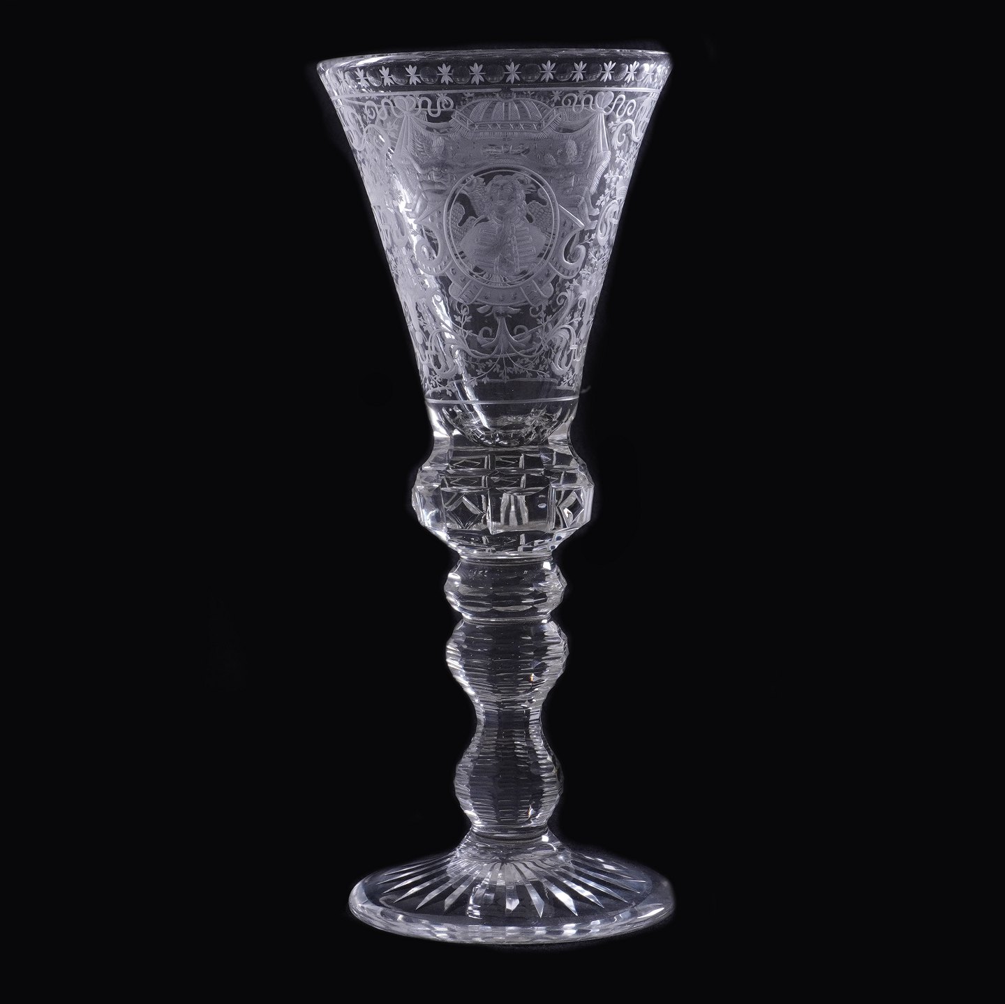Tysk glas pragtpokal indgraveret med adeligt portræt og kronet spejlmonogram