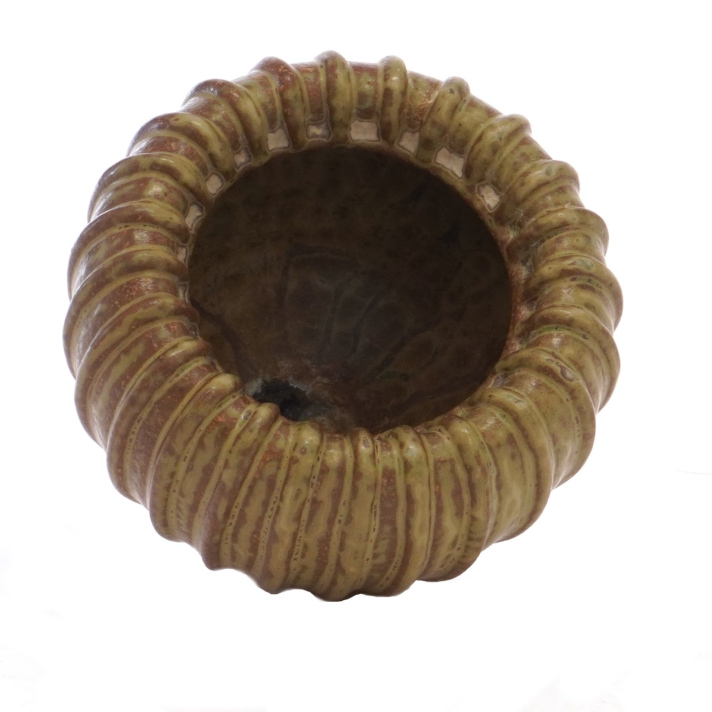 Arne Bang bredriflet vase med brungrøn glasur og hvælvet kant. Signeret. H: 10,5. D: 13cm